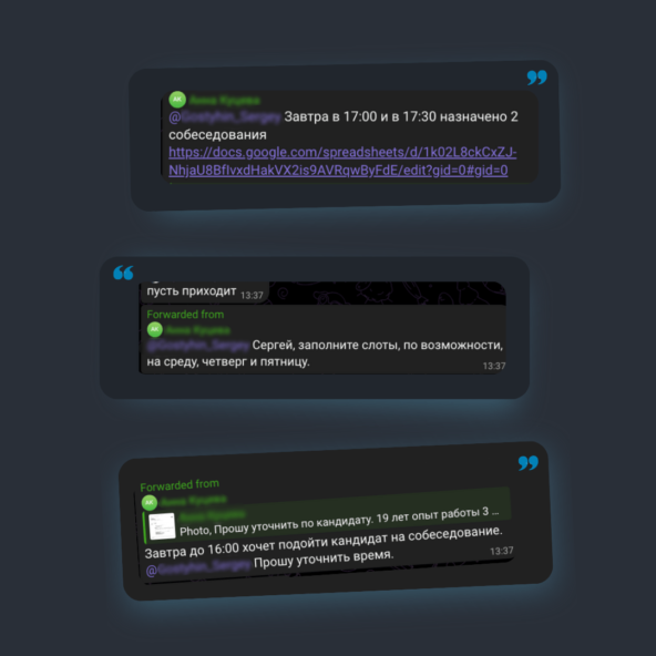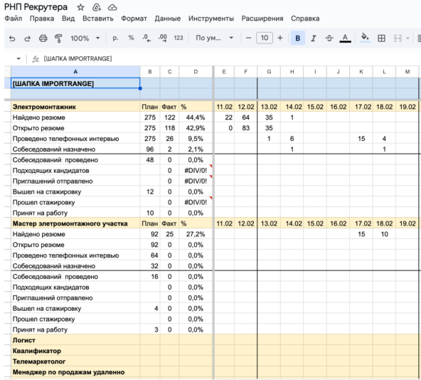 Мы разработали и внедрили скрипт обзвона кандидатов, но он не статичен — мы постоянно его дорабатываем. Записываем и анализируем каждый разговор, потому что оператор может не сразу находить общий язык с кандидатами, затягивать приветствие, неправильно формулировать вопросы или не уметь грамотно закрыть кандидата на встречу. Чтобы выявить такие узкие места, нужна запись разговора и его транскрибация. Это позволяет нам сразу видеть возражения кандидатов, понимать, где оператор недорабатывает, и оперативно корректировать скрипт. В результате конверсия из звонка в доходимость на собеседование стабильно растет. 4. Подключили мессенджеры Одна из проблем, с которой мы столкнулись, что многие кандидаты просто не берут трубку. Чтобы решить эту проблему, мы добавили коммуникацию через мессенджеры — пишем в WhatsApp и Telegram. Если кандидат не отвечает три дня, отправляем финальное сообщение с оффером и напоминанием, что он всегда может вернуться, когда будет готов. Так мы повысили конверсию дозвона и минимизировали потери потенциальных сотрудников. 5. Оптимизировали закупку резюме Покупаем резюме ежедневно, а не раз в неделю, чтобы контакты оставались актуальными. Если резюме залежалось, вероятность дозвона резко падает. Купили контакт в понедельник — в пятницу уже вряд ли до него достучитесь. Поэтому мы работаем малыми партиями, как работает Toyota или как советует Goldratt из теории ограничений. В понедельник купили контакты — сразу обзвонили, назначили собеседования на ближайшие дни. Во вторник купили новую партию — снова сразу обработали. Так мы сокращаем задержки, поддерживаем стабильный поток кандидатов и не даем базе «протухнуть». 6. Внедрили напоминания Кандидаты часто забывают о встречах, поэтому: Это уменьшает процент «неявок». Раньше ситуация была такая: рекрутеры на удаленке, бюджет уходит на зарплаты и вакансии, но кандидатов просто нет. Очередь на собеседования? Ее даже близко не было. Сейчас же, как видно по скриншотам, у нас уже есть первые приглашенные и проведенные собеседования. И все это — при гораздо меньших затратах, чем работа с удаленными рекрутерами или платное размещение вакансий. Почему? Потому что покупка резюме сразу дает доступ к нужным кандидатам. Мы не просто ждем, пока кто-то откликнется, а активно ищем. Как только новый кандидат выкладывает резюме, мы получаем уведомление, тут же покупаем его контакты и звоним. Для кандидата это выглядит так: он только разместил резюме — и сразу получает приглашение. Кто первый позвонил, того и тапки. За счет быстрой реакции мы быстро наполняем очередь на собеседования. Дальше уже дело за техническим директором: объяснить выгоды работы, закрыть сделку. А выгоды у компании есть: она стабильно платит, 15+ лет на рынке, крупные проекты, серьезные заказчики — кандидаты это ценят. Но мы не остановились. Чтобы расширять воронку, мы проанализировали функционал сотрудников и разделили задачи на простые и сложные. Логика простая: зачем квалифицированному специалисту тратить время на рутину? Мы передаем простые задачи подсобным рабочим, которые постепенно накапливают опыт. Через 3–6 месяцев они уже готовы к более сложным функциям. Так мы выстраиваем кадровый конвейер — вместо одной вакансии на супер-крутого специалиста, мы добавляем вакансию на начинающего специалиста. Тем самым ст