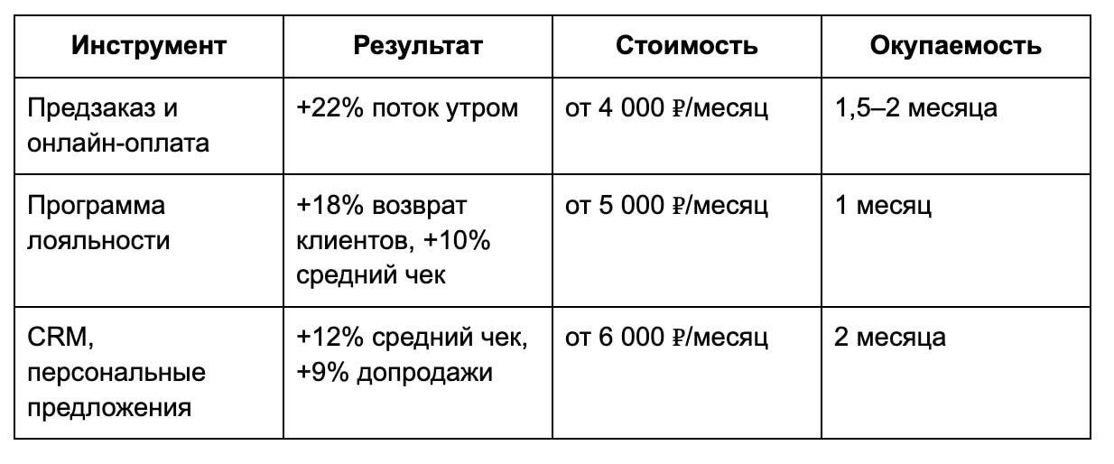 В сети кофеен, управляемой командой «Кофейного навигатора», этот инструмент показал сопоставимые результаты. На одной из точек, расположенной в деловом центре, предзаказы стали формировать до 18% от утреннего потока, что позволило увеличить оборачиваемость и за два месяца поднять выручку в пиковые часы на 22%. Стоимость сервиса составила 4 000 рублей в месяц, окупаемость наступила менее чем за два месяца.