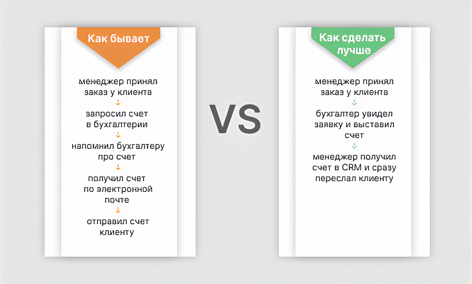 Нет системы, которая помогает видеть полную картину по проектам. Иногда непонятно, кто чем занят, как задачи распределяются между людьми, кто заменит специалиста, если завтра он уйдет на больничный. Программы и сервисы решают лишь отдельные задачи. Как перейти на уровень выше. Определить приоритетные направления для автоматизации. Если менять всё и сразу, есть риск создать слишком большой стресс для команды или поломать процессы. Попробуйте действовать так: Универсального рецепта автоматизации не существует, но есть действенный способ упростить себе жизнь: систематизировать документы. Разложите по папкам договоры, инструкции для команды, информацию о продукции, скрипты для звонков клиентам. Используйте корпоративный сервер или облачное хранилище. Когда наступит время подключать CRM, всё это не придется собирать по сотрудникам. Но главное: даже если уволится руководитель отдела, не будет необходимости выстраивать с нуля процессы, за которые он отвечал. Пример. В отделе продаж мебельной фабрики, которой руководит Александр, менеджеры выполняют такие задачи: Прием заказа выглядит так. Сначала сотрудник общается с клиентом и выясняет, какие у него потребности. Предлагает решение — конкретную мебель из каталога. Согласовывает. Затем заполняет договор, бланк заявки и документы на оплату. В этом процессе логичнее начинать автоматизацию с конца. То есть сделать так, чтобы все договоры, бланки и данные по заказам были в одном месте. Еще лучше, если система сама автоматически заполняют документы по шаблонам — значит, не будет ошибок и вырастет скорость обслуживания клиента. Какие решения использовать. CRM от ПланФикса легко подключить и настроить самостоятельно — вызывать программистов не придется. Вот что автоматизирует сервис: Платформа подойдет для бизнеса любого масштаба — неважно, сколько у вас клиентов и как долго длится цикл сделки. CRM сумеет обработать неограниченное число операций. Создать систему хранения рабочей документации тоже можно в ПланФиксе. Загружайте файлы на платформу, там же их редактируйте и добавляйте ссылки на облачные сервисы. Найти нужный документ легко по дате создания, автору или названию. А еще ПланФикс сохраняет историю версий файла — при необходимости возвращайтесь к предыдущим вариантам. Что происходит. Компания использует цифровые технологии в отдельных процессах. Программы и сервисы помогают выполнять повторяющиеся задачи на разных участках, но никак не связаны друг с другом. Например, отдел продаж создает заказы и оформляет договоры в CRM, а счета на оплату выставляет бухгалтерия в другой программе. Менеджеры каждый раз пишут бухгалтеру, чтобы запросить счет. Клиенты ждут, а некоторые теряют терпение и покупают у конкурентов. Как перейти на уровень выше. В рамках одного отдела соединяйте между собой программы, которые сотрудники используют для решения разных задач. Тогда получится бесшовный переход между платформами: например, бухгалтерские документы и производственные чертежи будут доступны в CRM. Цифровые сервисы всё чаще интегрируются с другими продуктами с помощью API. Это интерфейс, который позволяет программам обмениваться информацией. Функция полезная, и стоит ее учесть, даже если прямо сейчас она не нужна. С ростом компании может потребоваться объединить CRM не только с бухгалте