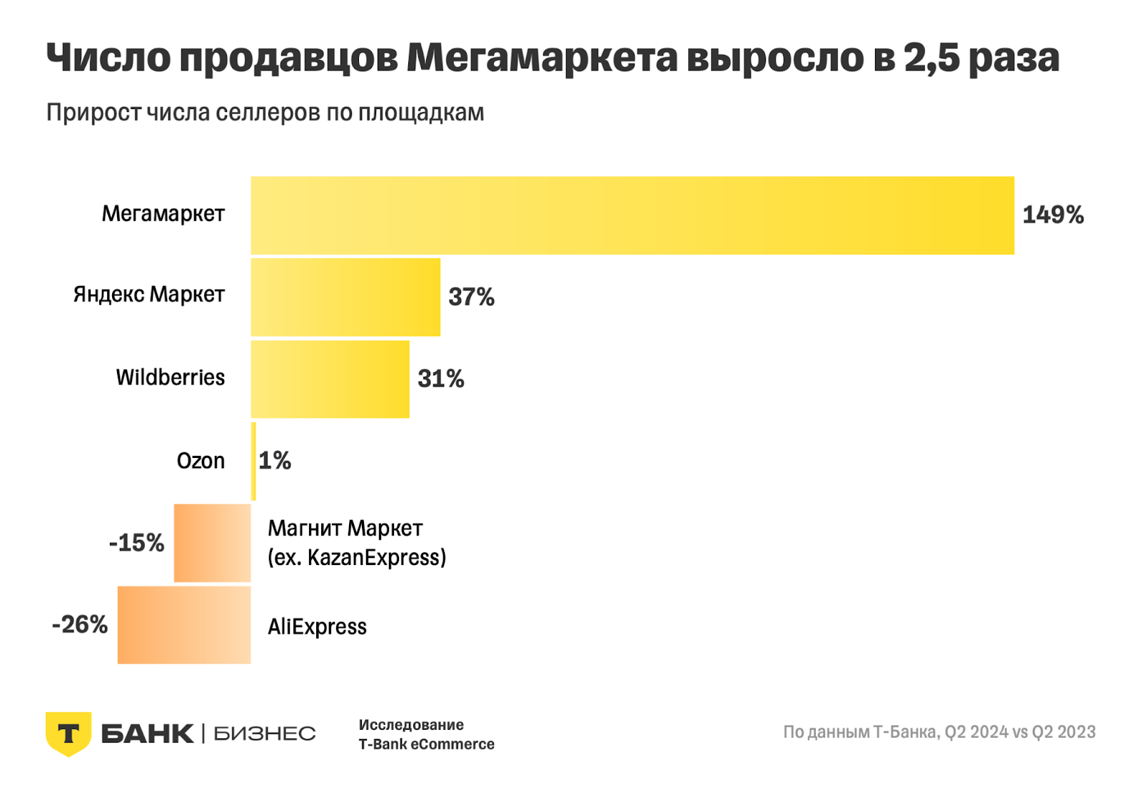 Например, использовать современные планировщики по типу ПланФикса, где можно не только фиксировать идеи, но и давать доступ коллегам, отслеживать хронику, настраивать расписание, распределять задачи и управлять загрузкой команды. Такое решение особенно полезно для стартапов, где несколько человек могут работать одновременно и с поставками, и с рекламой, и с аналитикой. Четкий план с приоритетами позволит не метаться между задачами и сосредоточиться на действительно важных шагах. Маркетплейс — это сотни тысяч товаров, и конкуренция в популярных категориях высокая. Просто загрузить продукт и ждать продаж — так себе стратегия. И дело не в том, что какие-то товары лучше или хуже. Успех зависит от того, насколько точно вы определите свою аудиторию, поймете их потребности и составите позиционирование бренда. Есть несколько ключевых моментов, на которые нужно обратить внимание при выборе ниши: Спрос. Оцените востребованность товаров через аналитические сервисы: Wordstat, MPStats, Shopstat, «Маяк» и внутренние отчеты маркетплейсов. С их помощью можно проанализировать ключевые показатели по запросам, определить список основных конкурентов, изучить данные об обороте и динамике продаж конкретных категорий. Конкуренция. Если в категории уже доминируют крупные бренды, пробиться без значительных вложений будет трудно. Лучше искать товары с умеренной конкуренцией или предлагать что-то уникальное. Маржинальность. Высокие продажи не всегда означают прибыль. Важно учитывать себестоимость, комиссию маркетплейса, затраты на логистику и рекламу. Например, хрупкие изделия сложнее в доставке. Если упаковка окажется дороже себестоимости товара, то цена для покупателей станет слишком высокой, и продаж не будет. Целевая аудитория. Один и тот же товар может быть ориентирован на разные группы покупателей, и от этого зависит всё: позиционирование, цена, упаковка, продвижение. Чтобы понять, кто ваша ЦА, определите, какие люди будут покупать товар, зачем им это нужно и по каким критериям они будут его выбирать. Когда вы уже разместите товары и получите первые заказы, важно регулярно анализировать ассортимент. Это поможет понять, какие товары приносят основную выручку, а что продается хуже всего. Чтобы не делать это вручную, можно использовать CRM-систему. Сервис будет собирать данные обо всех транзакциях и составлять отчеты. С их помощью вы сможете выявлять наиболее прибыльные направления и сосредоточить усилия на их развитии. По данным исследования T-Bank eCommerce, в 2024 году крупнейшими маркетплейсами в стране являлись Wildberries, Ozon и «Яндекс Маркет». Лидером по количеству селлеров остается Wildberries — здесь зарегистрировано 53% всех продавцов. В 2024 году число продавцов на «Мегамаркете» выросло в 2,5 раза, хотя его доля на рынке пока составляет всего 1,5%. Источник: исследование T-Bank eCommerce Большинство предпринимателей начинает продажи с одного маркетплейса. Но аналитика показывает, что покупатели Ozon и Wildberries пересекаются только на 55%. Это значит, что, если вы размещаете товар на одной площадке, вы можете потерять значительную часть потенциальной аудитории. Все крупные площадки предлагают универсальный ассортимент товаров, но у каждой есть свои ключевые категории: Если ваш товар относится к одной из этих категорий, логично начать с маркетплейса, где он наиболее востребован