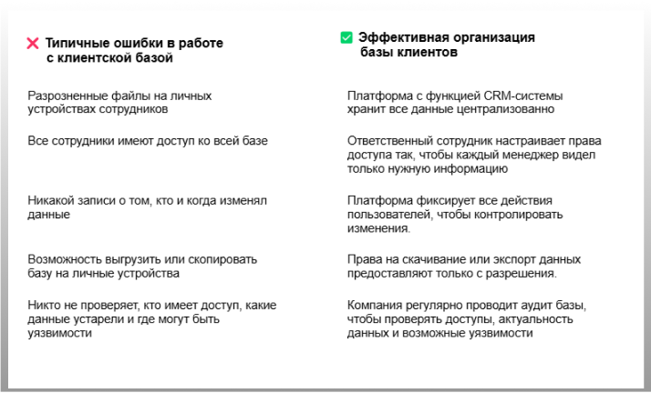 По данным американской телекоммуникационной компании Verizon, в 2024 году 68% всех утечек данных были вызваны человеческим фактором: ошибки, мошеннический обман и инсайдеры, 24% связаны с уязвимостью системы или подбором паролей и 8% — физические атаки на устройства или сервера. Утечки данных ведут к убыткам и судебным разбирательствам. Компания теряет клиентскую базу — выручка падает, сделки срываются, расходы на маркетинг и восстановление данных растут. По сведениям InfoWatch, больше всего затрат требуют сорванные сделки, аудит информационной безопасности и обучение персонала. Каждая из этих категорий обходится компаниям от 3 до 5 млн рублей. В дополнение к этим расходам в России за утечку персональных данных предусмотрен штраф до 15 млн рублей. Организации обязаны сообщать о таких нарушениях в Роскомнадзор, иначе им грозит дополнительное наказание за неуведомление. Должностные лица заплатят до 800 тыс. рублей, а юридические — до 3 млн рублей. Чтобы защитить информацию, стоит начать с организации работы с клиентской базой. Четкие правила работы с данными внутри компании и контроль доступа помогают защитить клиентскую базу от утечек. Например, организация может разработать регламенты, а в CRM-системе настроить права, ограничить экспорт данных и отслеживать действия сотрудников. Это снижает риск кражи данных даже при увольнении сотрудников, а компания сохраняет полный контроль над информацией. Централизуйте хранение. Представьте: менеджер перед увольнением копирует клиентскую базу на флешку, маркетолог ведет дублирующий файл в Excel, а стажер записывает контакты в блокнот «на всякий случай». В итоге компания утрачивает контроль над данными и теряет конфиденциальную информацию. Разрозненные файлы на ноутбуках сотрудников, Excel-таблицы и заметки на стикерах повышают риск утечек. Невозможно предсказать, куда попадет эта информация и кто сможет ее использовать. Объедините все данные в одном защищенном месте, например в CRM-системе. Настройте уровни доступа, чтобы только авторизованные сотрудники могли просматривать или редактировать информацию. Это упростит управление базой и повысит безопасность данных. Структурируйте базу. Клиентская база без порядка похожа на плохо организованный шкаф. Вещи лежат хаотично: нужное трудно найти, а лишнее занимает место. То же происходит и с данными. Чтобы быстро получать доступ к необходимой информации, стоит навести порядок. Например, покупателей можно разделить по регионам, статусам и продуктам — это ускорит поиск данных и облегчит анализ клиентской активности. А если каждый сегмент закрепить за конкретным сотрудником, то доступ к информации будет ограничен, а это повысит уровень защиты клиентской базы от несанкционированных действий. Допустим, звонит клиент из Новосибирска. Вы знаете, что за этот регион отвечает Инна. Открыли сегмент, нашли нужную запись, всё ясно: кто контактировал с покупателем, когда была последняя сделка и что обсуждали. Если в базе возникают ошибки, вы знаете, что ответственность за участок несет Инна, и идете к ней за уточнениями. Так вы экономите время, избегаете проблем и делаете систему учета прозрачной. Разграничьте права доступа. Представьте, что ваша база — хранилище с ячейками, и у каждого сотрудника есть ключ только от той, которая нужна ему для работы. Менеджер вид