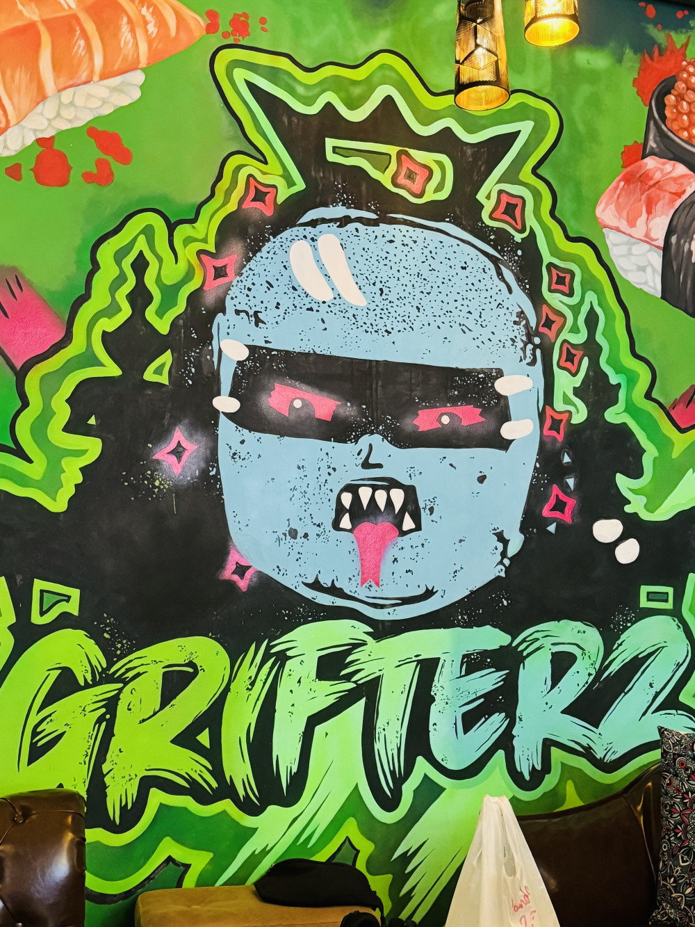Во время нашего с мужем отдыха на Пхукете мы случайно забрели в кафе с интригующим названием «Grifterz,» что переводится как «мошенники.» Нас сразу же привлекла большая, захватывающая картина на одной из стен. Странный, даже немного пугающий персонаж, яркие краски, необычный стиль — она выделялась на фоне привычного тропического антуража. Заинтригованные, мы решили узнать о ней больше. Достав телефоны, мы начали искать информацию о картине в интернете. Каково же было наше удивление, когда выяснилось, что это не просто настенная роспись, а физическая копия NFT!