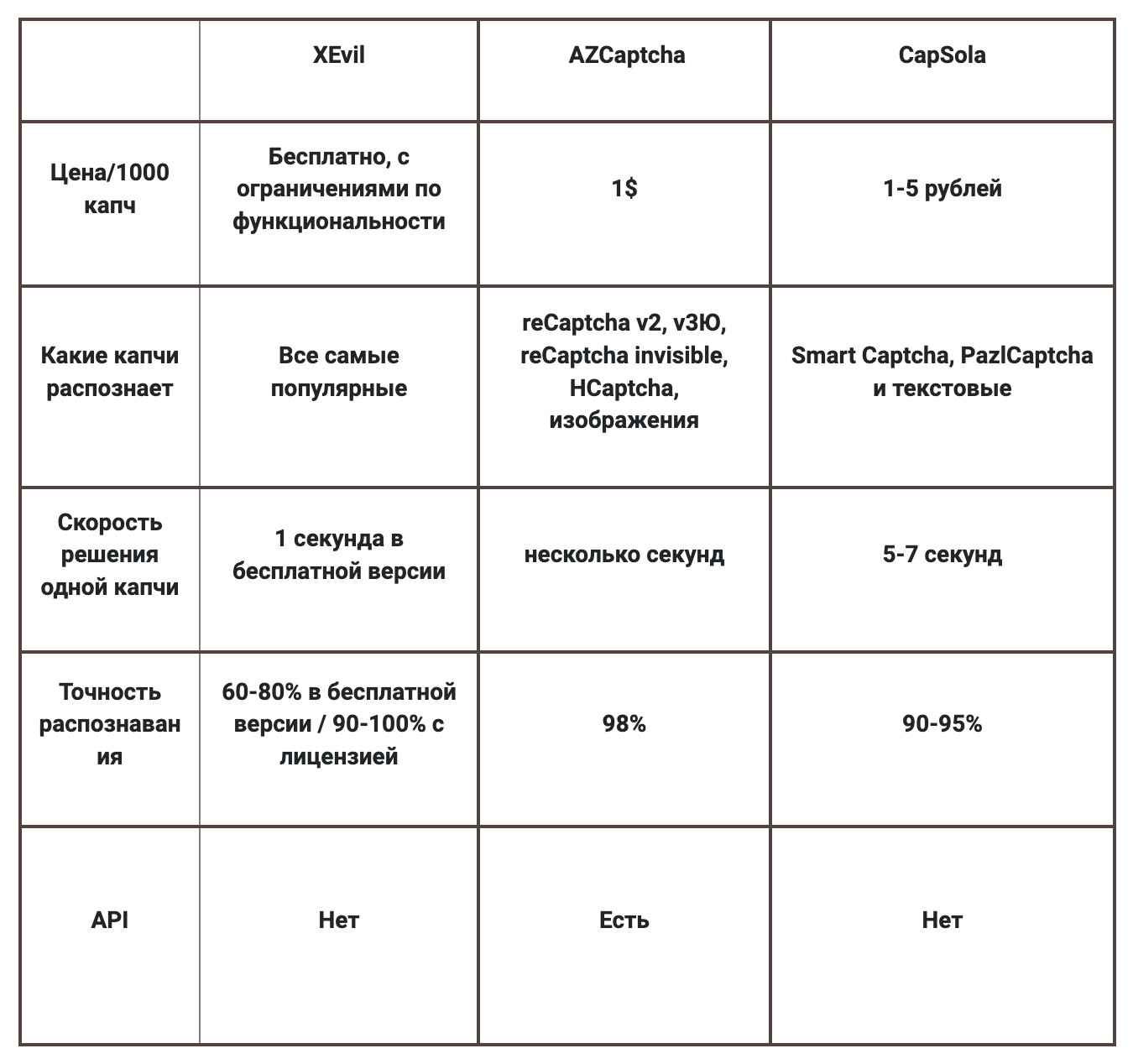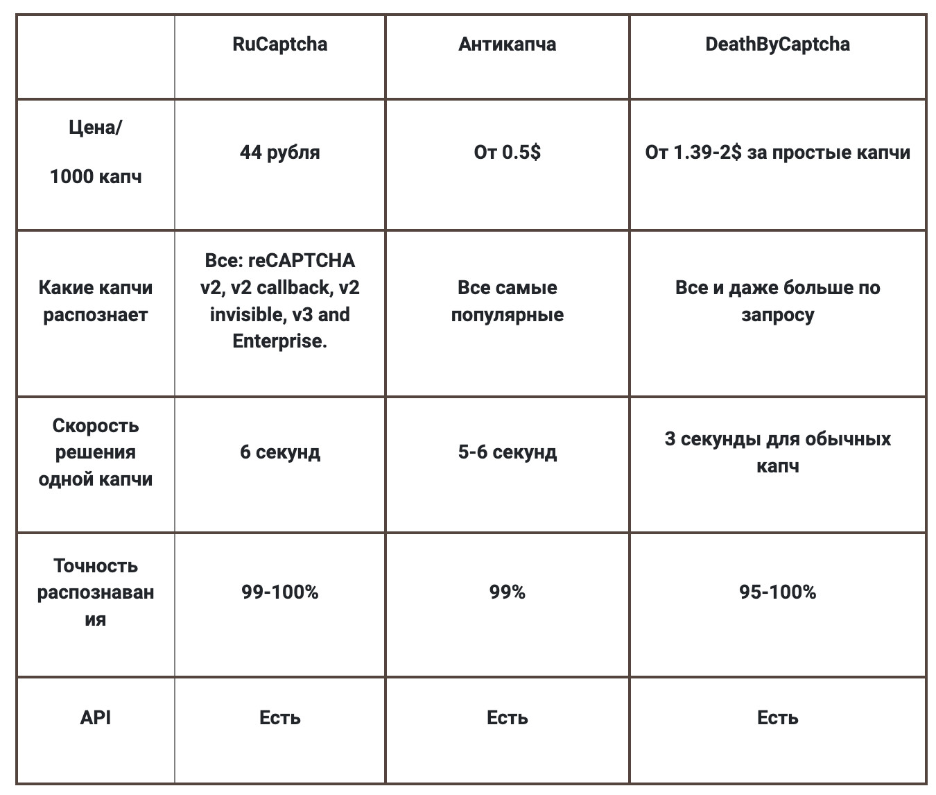 Оставил для вас таблицу по 5 самым важным параметрам: так сервисы удобнее сравнивать. Знаете еще какие-то удобные сервисы для распознавания капч? Поделитесь в комментариях!