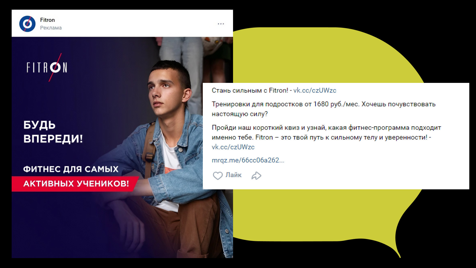 У нашей стаи есть опыт работы с этой аудиторией. Мы успешно привлекали лиды на продажу тин-карт и фитнес-карт для студентов. Принцип — тот же, что при работе с ЦА 50+: фотографии ЦА, обозначение аудитории и ее запросов, а также короткий тест на подбор тренировки.