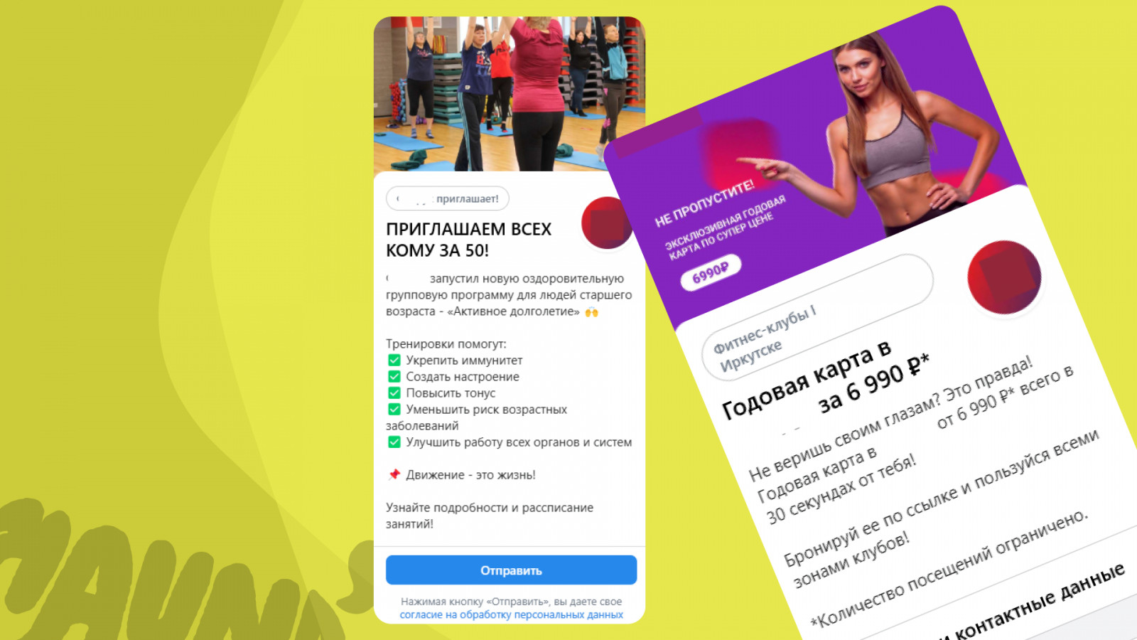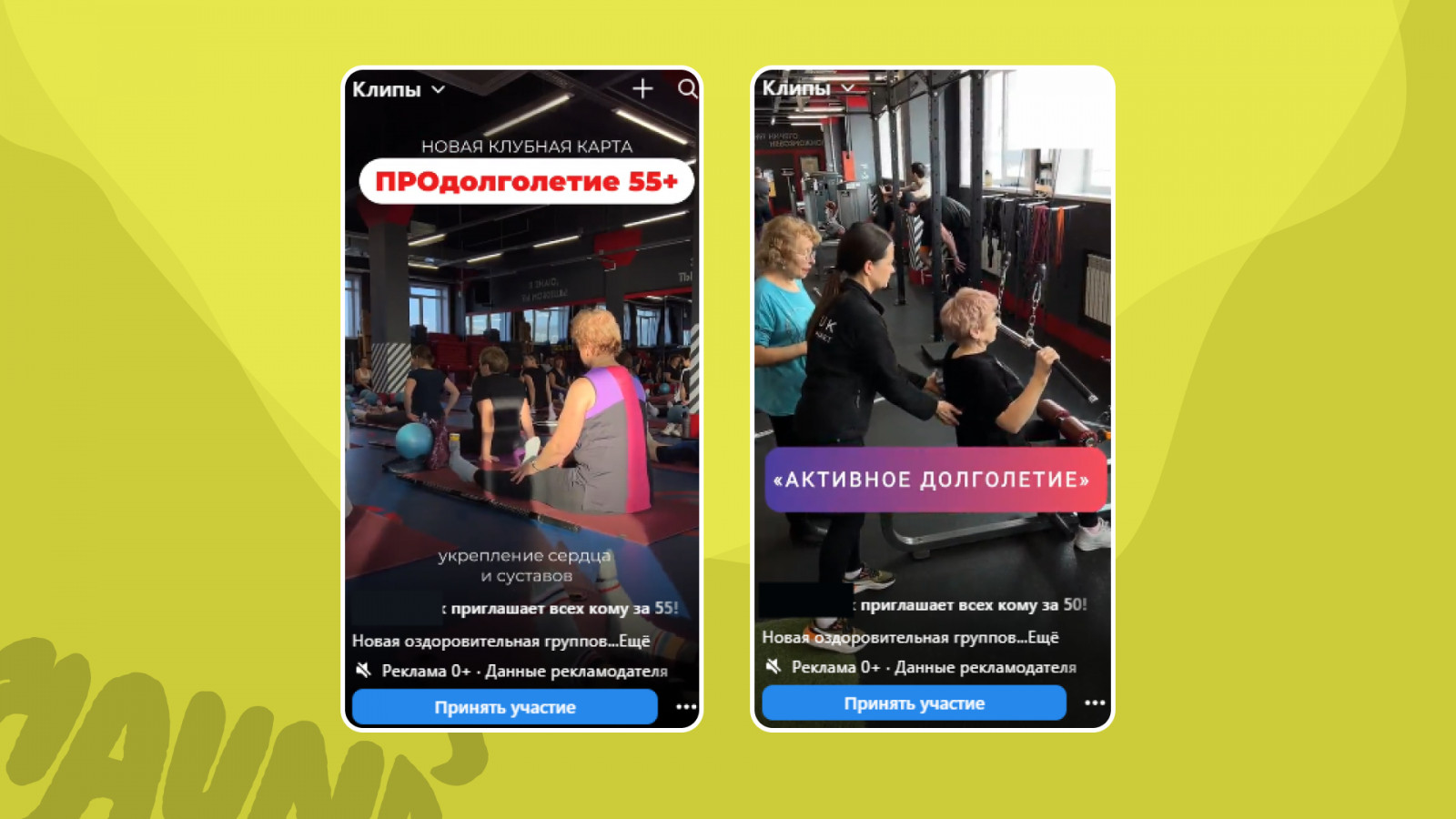 - Настроили две кампании. Первая — под старшее поколение (50+), акцент на групповые тренировки.