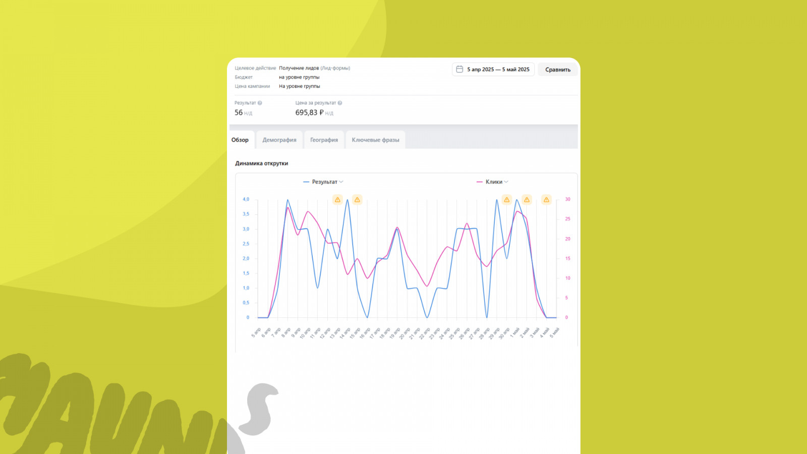 - Средняя цена — 540 ₽, на кампании 50+ — от 320 ₽.