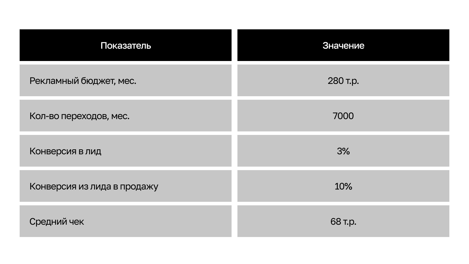 Стартовые условия: Представим, что ваш первоначальный рекламный бюджет — 280 т.р., услуги агентства — 150 т.р. При таких условиях вы получаете 21 продажу и прибыль в размере 998 т.р. в месяц А если увеличить затраты на рекламу на 10%, до 308 т.р., можно сделать уже 23 продажи. Казалось бы, всего 2 дополнительных покупки, но ваша прибыль уже ощутимо перевалит за миллион и составит 1 112 800 т.р. Натурально эффект бабочки в действии! Но важно понимать, что инвестиции в маркетинг — краткосрочные. Вы быстро получаете результат, но и перестраиваться придется оперативно. Если рекламная кампания дает результат здесь и сейчас, не факт, что так будет и потом. На сам спрос влияет множество факторов: экономическая ситуация, новый конкурент и даже внезапное похолодание. Вывод таков: как бы ни было все гладко в моменте, останавливаться нельзя. Выстроить и запустить воронку, пусть даже отлично работающую, недостаточно. Нужно провести оценку эффективности инвестиций в маркетинг. Мы на этом этапе собираем статистику, анализируем уже полученные результаты и докручиваем воронку до предела возможностей. А для этого — рассчитываем метрики. Для ловли добычи требуются быстрая реакция и острый нюх. Так же, как гончая берет след, маркетологи отслеживают поведение ЦА с опорой на данные. Подробнее остановимся на ключевых показателях и их значимости для бизнеса. Руководителям необязательно вникать в детали, но нужно понимать основные показатели и их влияние на прибыль. Если вы знаете: То вы на достаточном уровне погружены в маркетинговую деятельность компании. Теперь разберем значимые показатели. Путь клиента можно разбить на 4 фазы: клик по рекламе, заявка через лендинг, контакт с менеджером и покупка. Для каждой ступени предусмотрен показатель. Это кликабельность рекламы. Показывает, насколько точно кампания попала в ЦА и зацепила ее. Если много кликают, значит, затронуты боли, потребности или другие аспекты. CTR — важная метрика, но не определяющая, так как далеко не всегда высокая кликабельность конвертируется в большое количество лидов/продаж. Поэтому анализировать маркетинг нужно глубже. Кликнув на рекламу, пользователь попадает на посадочную страницу. Лендинг побуждает его совершить целевое действие: заполнить анкету, оставить телефон. Так посадка конвертирует посетителей в технические лиды. После этого можно начинать коммуникацию с потенциальными клиентами. Здесь мы оцениваем, насколько эффективно технические лиды конвертируются в квалифицированных. То есть в таких пользователей, которые: Аудитория, качественно собранная на третьем уровне метрик, — это уже те самые потенциальные клиенты, которые уже практически готовы купить абонемент. Остается немного дожать — и переходить на... Здесь оценивается конверсия из квалифицированного лида в клиента, оформившего абонемент. Это важнейшая фаза, потому что именно с покупателей клуб получает прибыль. Но на финальной стадии лида дожимает отдел продаж, и преимущественно это его зона ответственности. Маркетологи больше влияют на все, что происходит до. Неверным было бы утверждать, что чем выше уровень метрики, тем она важнее. Правильнее расставить приоритеты так: Более значимы показатели, которые непосредственно ведут к продажам, так как компания стремится зарабатывать. Бизнес стоит во главе, а маркетинг выполняе