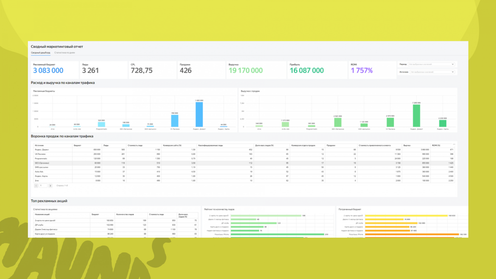 Мы в Haunds занимаемся перформанс-маркетингом для фитнес-клубов с 2017 года. За это время насмотрелись на всякое: на Яндекс.Метрику с пятью целями «для галочки», на эксельки, которые заполняют раз в месяц по памяти, на руководителей, которые оценивают эффективность рекламы по количеству звонков на ресепшен. В какой-то момент мы поняли: пока у клиента нет нормальной аналитики, мы работаем вслепую. И начали делать ее сами.