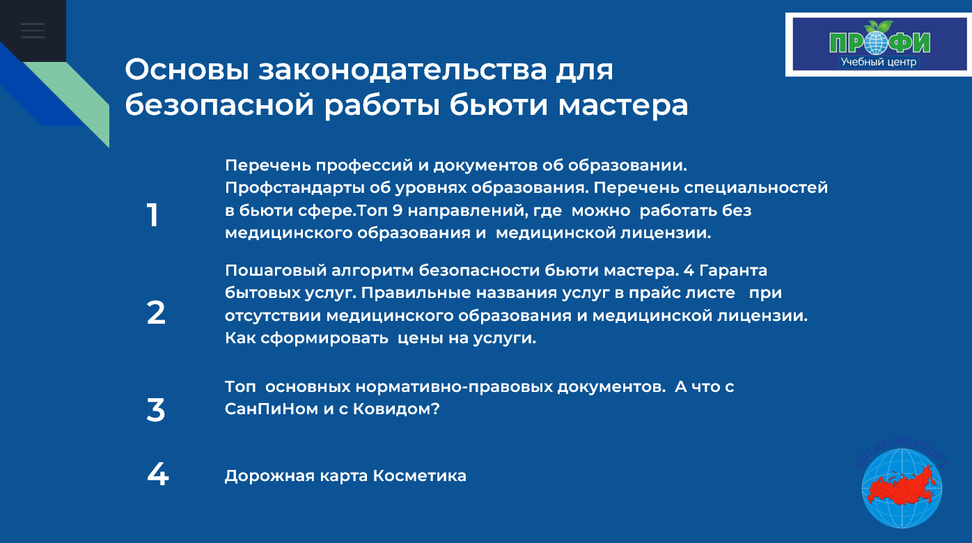 — на какие аспекты работы в индустрии красоты надо обратить внимание для обеспечения правовой безопасности; — Санитарно-эпидемиологические требования к эксплуатации помещений, оборудования — условия деятельности хозяйствующих субъектов, осуществляющих продажу товаров и выполнение работ или оказание услуг — правила, касающиеся деятельности салонов красоты, парикмахерских и косметологических кабинетов — требования, которые изложены в разделе 8.2 САНПИН и содержаны в 38 пунктах — требования САНПИН, на которые обычно не обращают внимание мастера и избежите штрафов при проверках; — какие документы должны быть у владельца бьюти бизнеса — обязательные документы, которые требуют при проверках, в том числе журнал учёта проверок ИП или юр. лица — правильность заполнения и ведения журнала проверок; — заведёте обязательные журналы — сможете их заполнить — возможные формы легализации своего бьюти бизнеса — на основе сравнительной таблицы выбрать приемлемый для себя вариант оформления — вида разрешённой деятельности — системы налогообложения, принципы учёта; — соберёте обязательные документы — как и где расположить; — сможете оформить свою вывеску 2. Топ 6 нормативно-правовых документов, в которых прописаны: 3. Комплекты, в состав которых входят перечень документов: ✅ С официальным документом об образовании на руках можно работать без оглядки на проверки. При его наличии мастер имеет полное право заниматься своей деятельностью. При наличии и правильном ведении всех необходимых документов в бьюти бизнесе штрафы не страшны! ✅ Если мастер не боится никакой проверки, то чувствует себя уверенно и спокойно. Это психологический момент, который сильно сказывается на результатах вашей работы и отношении клиентов к вам, позволяет ставить достойные цены на услуги. ✅ Государственное Свидетельство о профессии даёт мастеру полное право широко рекламировать свои услуги и привлекать новых клиентов. Конечно, можно себя рекламировать и без Свидетельства, но когда «в гости» пожалуют проверяющие, что им показать? ✅ Клиенты доверяют мастерам и студиям, у которых в полном порядке ведение всей необходимой документации и нет нарушений в ведении бизнеса, в этом случае исключены происки потребителей экстремистов. ✅ Потребитель может быть спокоен за качество обслуживания и это трамплин для роста бизнеса. Можно рассчитывать на лояльность и высокую возвращаемость клиентов. ✅ Можно оформить субсидию на обучение или развитие бизнеса. ✅ Есть повод отстроиться от конкурентов и поднять цены на услуги. Чтобы узнать, какие документы должны быть на рабочем месте именно у вас и как их получить собрала для вас мастер класс, где представлена Готовая инструкция для бьюти мастера по обеспечению 100 % правовой безопасности, которая поможет: 1. Материалы по теме: «Безопасная работа бьюти мастера»: 1. Видеоурок о правовой безопасности и о правильном образовании мастера в бьюти 2. Презентация "Действующий СанПин 3. Проект изменений, вносимых к действующему СанПин 4. Презентация «Что проверяют у бизнеса» 5. Презентация «Обязательные журналы» 6. Презентация «ИП или самозанятость» 7. Презентация «Уголок потребителя» 8. Шаблон информационной вывески 2. Топ 6 нормативно-правовых документов, в которых: 1. Услуги, которые можно оказывать без медицинского Образовани