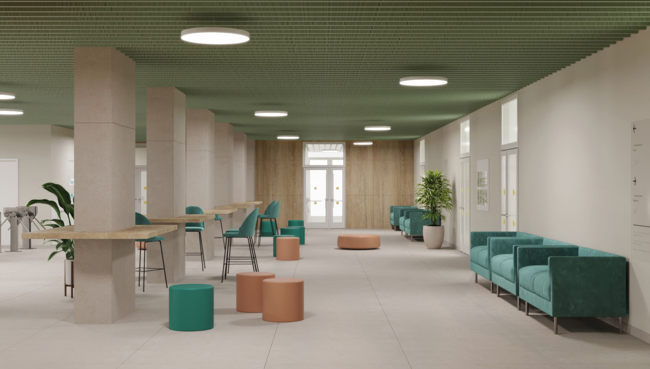 Вестибюли, коридоры и зоны рекреации оформлены в теплых успокаивающих тонах, с акцентным зеленым цветом на потолке или стенах, что придает помещениям свежесть и способствует расслаблению. Интерьер ориентирован на создание современного и комфортного пространства, приближенного к городской среде. В зонах, где присутствует высокая проходимость, на стенах предусмотрен керамогранит. Особое внимание девелопер уделил книжному стеллажу лососевого оттенка, плавно переходящего на потолок. Такой стеллаж появится в одном из коридоров школы. Пространство будет грамотно зонировано за счет цветных ниш с местами для отдыха и общения, буфетными зонами и шахматными кружками. Использование современных источников освещения позволит равномерно освещать все пространство в течение дня.