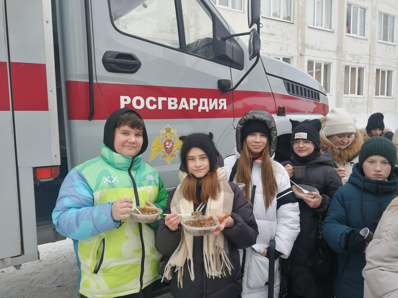 После активных игр на свежем воздухе ребят ждала настоящая солдатская каша и горячий чай, которые приготовили повара воинской части.