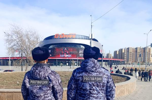 Сотрудники вневедомственной охраны Росгвардии осуществляли пешее патрулирование внутри ледовой арены и вблизи спортивного объекта.