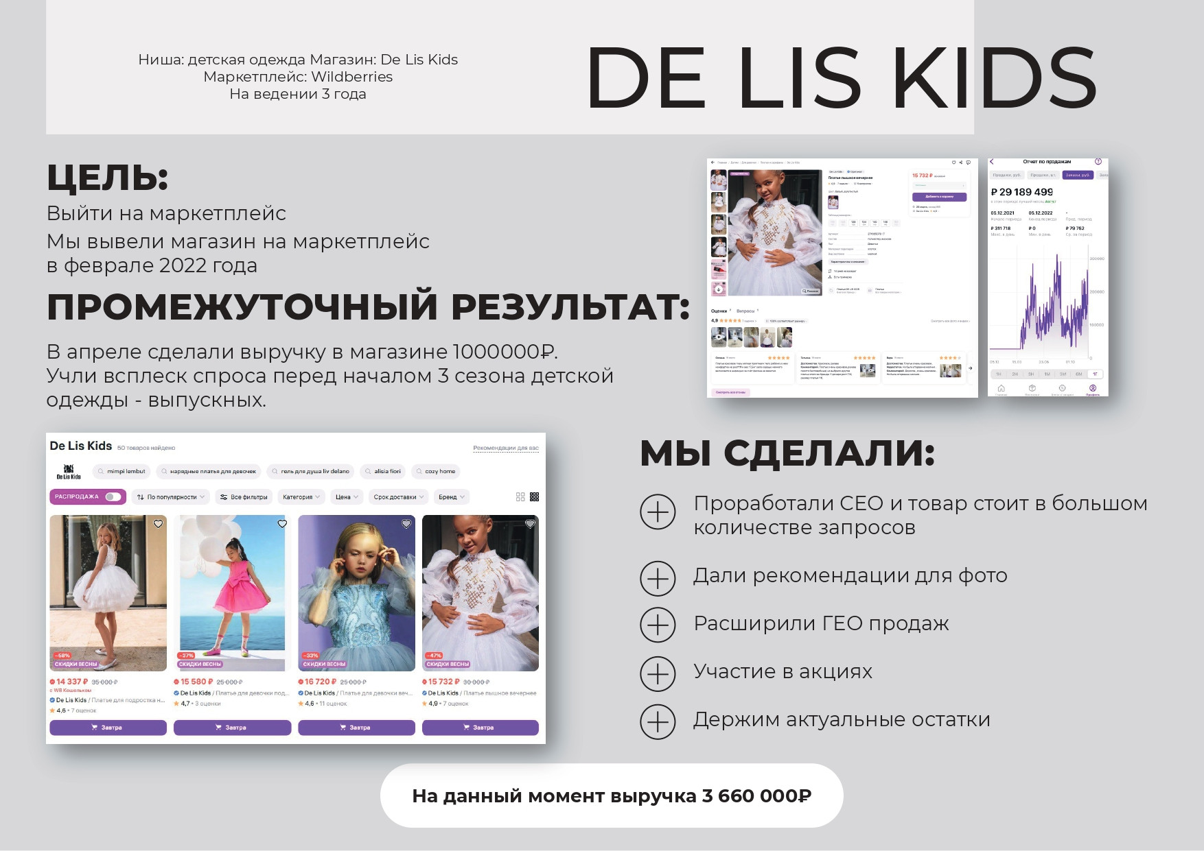 Бренд De Lis Kids специализируется на продаже детской нарядной одежды — выпускные платья, наряды для праздников, фотосессий и утренников. До 2022 года продажи шли через Instagram и офлайн-магазины. Потенциал был очевиден, бренд вышел на Wildberries.