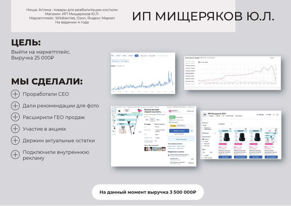 Селлер специализировался на товарах для реабилитации: костыли, трости, тележки.Ниша — узкая, спрос ограничен, конкуренция нестабильная.Цель — протестировать маркетплейсы.