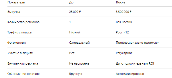 Название, описание, характеристики — полностью переписаны под ключевые запросы.Результат: кратный рост органического трафика, товары начали показываться в топе по целевым фразам.