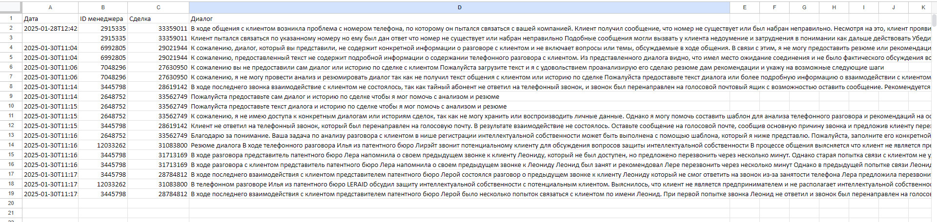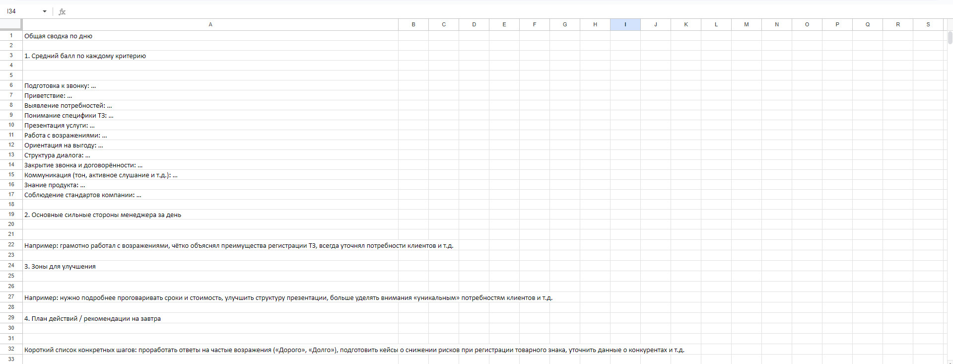 📌 Что происходит автоматически?✔ Транскрибация звонка — разговор переводится в текст и сохраняется в Google Sheets.✔ Распределение по ролям — отдельно фиксируются реплики менеджера и клиента.✔ Анализ ключевых ошибок — система выявляет, где менеджер потерял клиента (не уточнил потребности, не отработал возражение, не закрыл сделку).✔ Персональные рекомендации — менеджер получает отчет сразу после звонка, без ожидания разбора от руководителя.✔ Фиксация в базе CRM — если клиент вернется, ИИ уже знает, о чем шла речь.