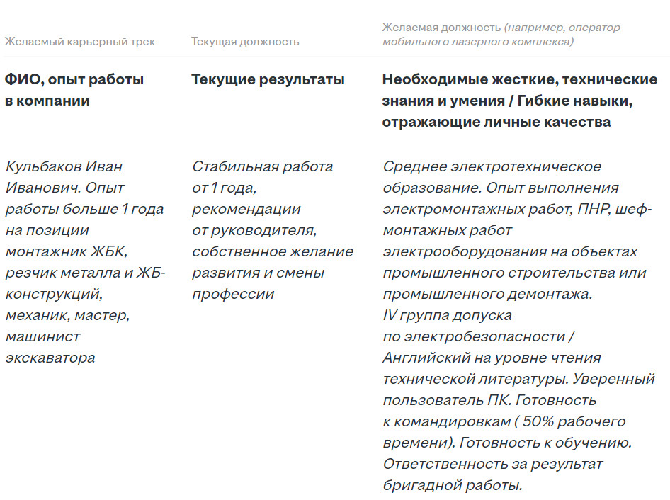Вы можете оформите свой запрос-предложение в удобном и наглядном формате, например, в виде таблицы. Обсудите данный свод с директором по персоналу или непосредственным руководителем. Возможно, они добавят к списку дополнительные компетенции и подскажут области знаний, которые необходимо изучить. Затем обсудите форматы получения данных компетенций. В некоторых компаниях, например, существует система наставничества, где более опытный руководитель помогает сотруднику в приобретении новых компетенций. Если знания можно получить в образовательном учреждении, возможно, руководство направит перспективного кандидата на целевое обучение или курсы. Б) Отсутствие инициативы и поддержки руководства Многие специалисты, даже обладая нужной квалификацией, не проявляют желания расти. Если вы чувствуете, что вам не хватает мотивации, обсудите с руководителем свои страхи и возможности. Задайте себе вопросы: ● Нравится ли вам текущая работа? ● Какие навыки вы хотите развить? ● Как вы можете помочь или помогаете уже коллегам и компании? __________________________________________________________ Иногда сотрудник уже выполняет функции руководителя без нормативно закрепленной за ним должности. Ответы на вопросы выше помогают изменить и собственное отношение к росту и отношение компании к Вашей компетенции. _______________ В) Отсутствие возможностей роста в рамках компании Если кажется, что в компании нет перспектив, изучите истории успеха коллег. Узнайте, как они продвигались по карьерной лестнице, и составьте список лиц, принимающих решения. Используйте внутренние каналы коммуникации (например, опросы о карьерных предпочтениях). Например, в некоторых компаниях ежегодно запускается опрос, в котором выявляются желание сотрудников расти или рассмотреть возможность горизонтального роста. Каждый член нашей команды активно участвуют в анкетировании с последующим обсуждением карьерных перспектив, программы адаптации и обучения. Поэтому игнорировать подобные механики роста не стоит. Вопросы для обсуждения с коллегами: ● Какие навыки будут востребованы в ближайшем будущем? ● Какие программы обучения они рекомендуют? ● Кто принимает решения о назначении на новую должность? Рекомендация 2. Составьте план действий Недостаточно знать, как попросить повышение. Важно самостоятельно и проактивно строить свой карьерный путь. 1. Запишите шаги для карьерного роста с конкретными сроками. 2. Подготовьте аргументы для встречи с руководителем (акцент на вклад в развитие компании, а не личные причины). 3. Уходите с четким пониманием дальнейших шагов. Помните, все возможно. Например, в нашей группе компаний в 2024 году один из инженеров ПТО перешел в продажи, и это успешный опыт, которому сейчас рад весь отдел и сам сотрудник, специалист по тендерам стал руководителей технической службы, специалист по документам стала эффективным рекрутером, а из состава кадрового резерва производства 6 человек стали управленцами, заняв более высокую позицию. Если возможности для вашего роста в компании исчерпаны, просмотрите предложения на рынке, обновив резюме. Но при смене работы обязательно проверяйте работодателя: отклики в интернет-отзовиках, рекомендации в групповых сообществах в социальных сетях и мессенджерах. В желании получить быстрый карьерный рост, который, к слову, не всегда и не у вс