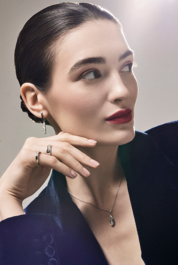 Благодаря зеркальному касту бриллианты в украшениях коллекции выглядят воздушно и объемно, создавая эффект «парящих» камней. А холодный блеск белого золота добавляет ювелирным изделиям еще больше сияния и сдержанной элегантности.