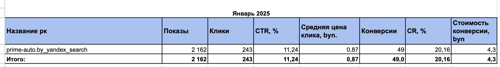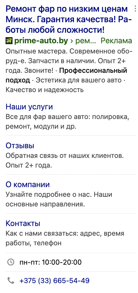 Также сделали акцент на геолокацию (Минск) и разделили семантическое ядро по группам услуг для более точного таргетинга.