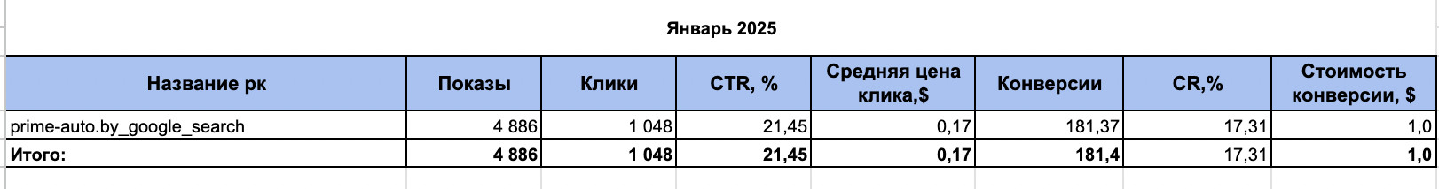 Общий результат: 230 заявок с сайта за первый месяц работы.Средняя стоимость заявки: 1,16 доллара.