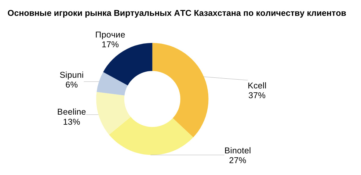 Лидером рынка стал крупнейший мобильный оператор страны — «Кселл», занявший 37% рынка. Его догоняют украинский «Binotel» (27%) и «Beeline» (13%). «Кселл» занял лидирующую позицию благодаря тому, что одним из первых запустил продукт ВАТС на рынке и предоставил качественные интеграции с популярными в Казахстане CRM-системами. «Binotel», не являясь оператором связи, предлагает программное обеспечение и качественное техническое обслуживание. Опыт компании, накопленный на украинском рынке, был успешно перенесён на рынок Казахстана, где «Binotel» занимает значительную долю. «Beeline» запустил виртуальную АТС только в прошлом году, но сумел значительно нарастить продажи и войти в ТОП-3 игроков рынка. Стоит отметить активность российских сервисов, таких как «Sipuni», которые стремятся выйти на альтернативные рынки. Однако эксперты отмечают, что российским сервисам будет сложно конкурировать на рынке Казахстана из-за отсутствия собственной номерной емкости и санкционных рисков. Внедрение технологий, таких как CRM и FMC (Fixed Mobile Convergence), в ближайшие годы усилит конкуренцию на рынке. Эти технологии позволяют объединять корпоративные SIM-карты с ВАТС, что повышает контроль за продажами. Всё это приведет к росту рынка с темпом не менее 50% в год. Полный анализ, прогнозы и данные о ключевых игроках рынка представлены в отчёте Data Hunters Research по ссылке.
