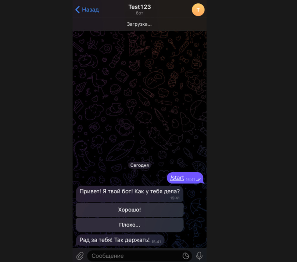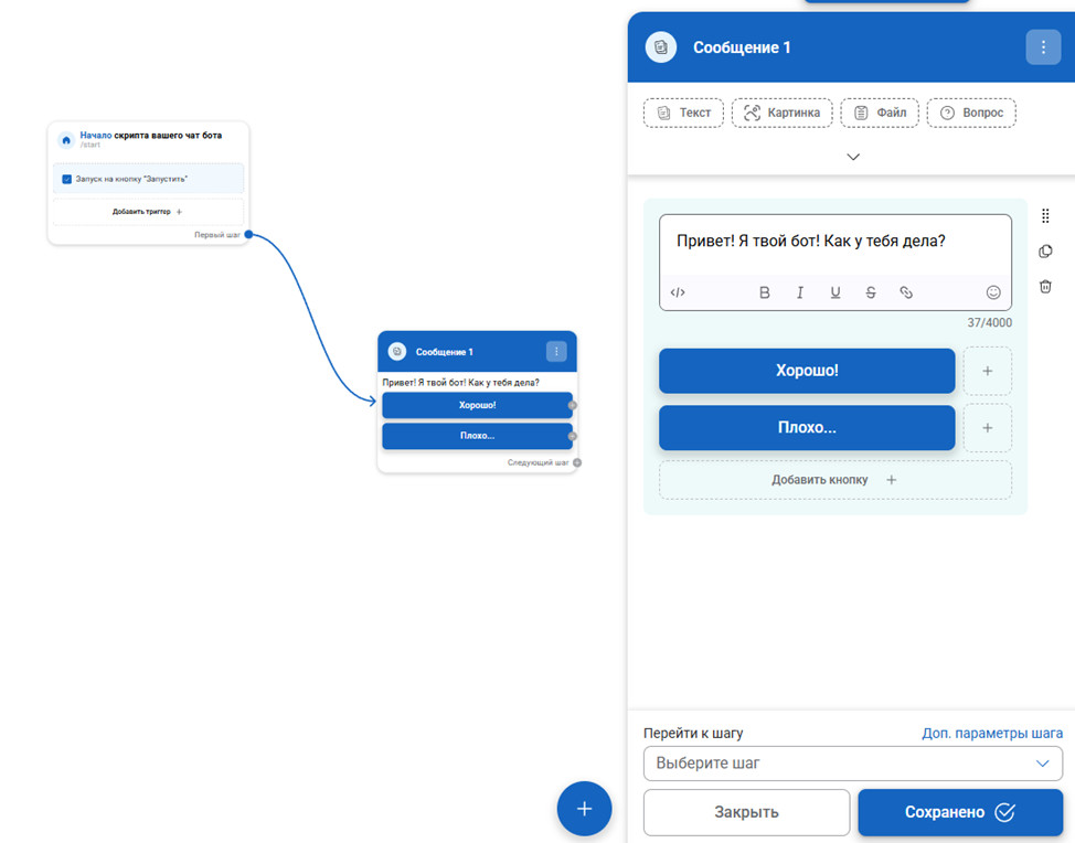 «Сообщение 1» напишите текст, к примеру: «Привет! Я твой бот! Как у тебя дела?».