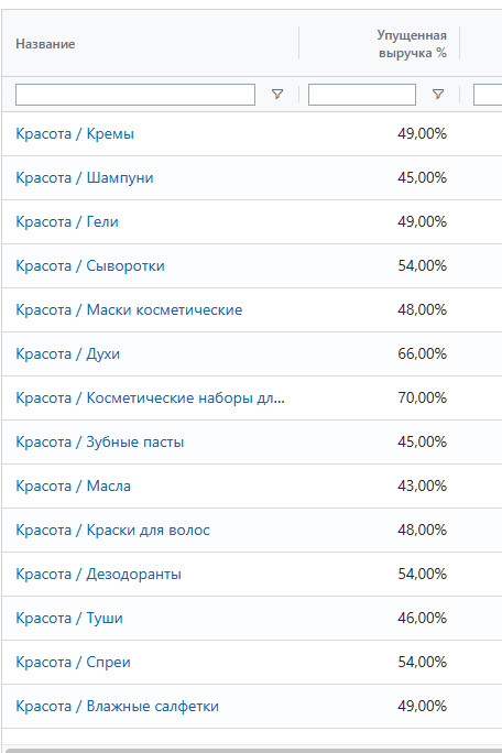 И какое чудо мы здесь видим. Упущенная выручка в некоторых подкатегориях достигает 70%!