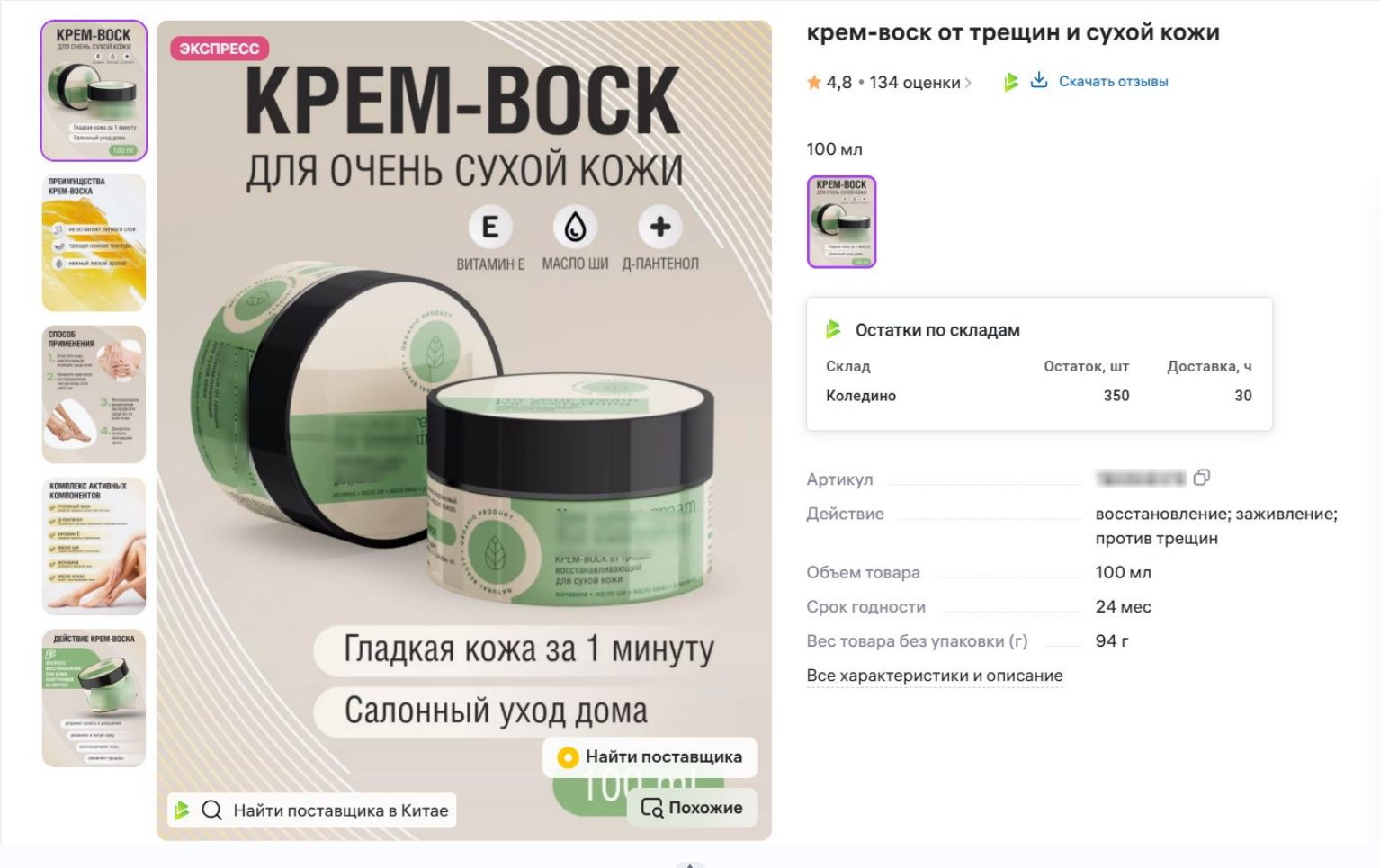 Итак, начнём по порядку. В ассортименте продавца только один артикул: «Крем-воск для сухой кожи, 100 мл.» Данный крем-воск появился на рынке 19 января 2024 года, общее количество продаж не превысило 500 штук за год, суммарная годовая выручка составила всего 155.000 руб.