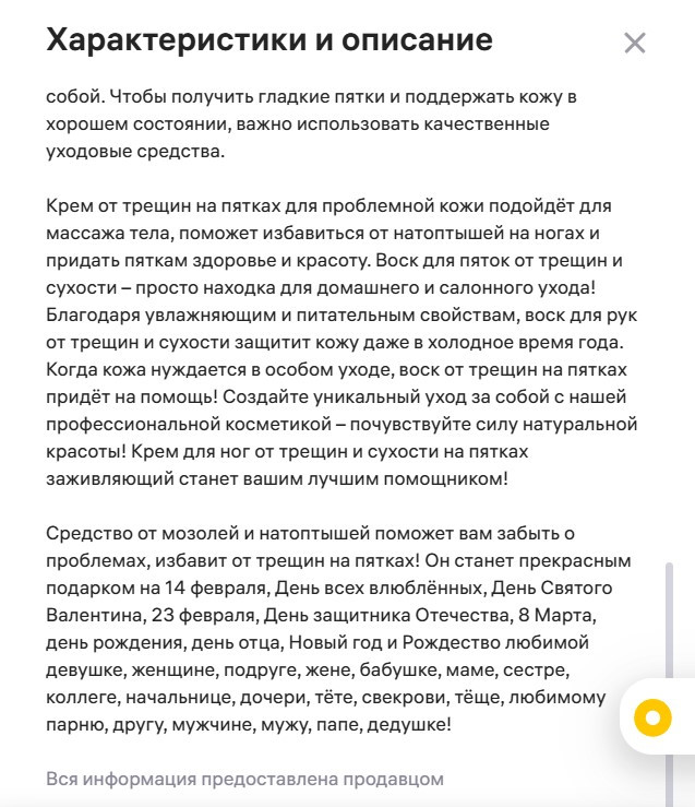 Карточка заполнена не полностью: отсутствует название бренда, видео и широкое описание. Разумеется, это ограничило попадание в многие ключевые запросы, такие как «Крем от трещин на пятках», «Крем для ног», «подарок на 14 февраля», «День всех влюблённых», «День Святого Валентина», «23 февраля» и т.д.