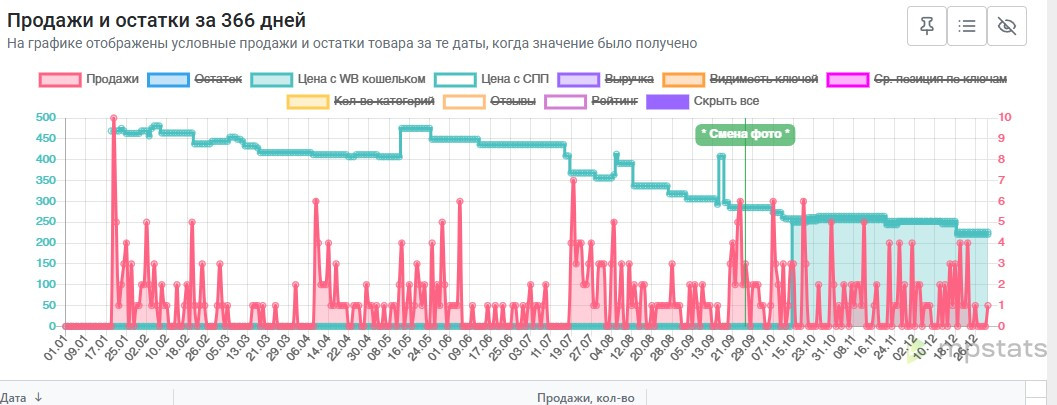 Ну, и чтобы не быть голословным, приведу скриншоты. На 1 фото — описание у крем воска с минимум продаж. На 2-4 фото тот крем, что делает 280 миллионов. Фото 2, 3 и 4 и развернутое описание с множеством ключевых слов (запросов вашей аудитории) Двигаемся далее. Для товара не применяется внутренняя и внешняя реклама, из-за чего позиции товара достаточно низкие. В 2025 году новому продавцу уже невозможно попасть на первую страницу поисковой выдачи без запуска рекламы. Первая страница выдачи состоит исключительно из продвигаемых карточек. Ладно, Бог с ней с главной страницей, даже по самому частотному запросу «крем воск», в котором присутствует товар, карточка находится аж на третьем листе выдачи. Позиция карточки 53. То, есть клиент сначала увидит 52 других крема и лишь потом тот, что на обзоре. Клиенту нужно очень постараться, чтобы найти этот товар на маркетплейсе. Это ещё одна дырка в тонущем судне. Отгрузка товаров происходит только на один склад Коледино. При создании карточки на этот склад была отгружена 1000 единиц товара и она до сих пор не распродана. Из-за этого товар имеет низкий индекс локализации и высокую вероятность истечения срока годности до полной продажи остатков. Индекс локализации — это показатель, отражающий долю заказов, совершенных в пределах определенного региона от общего числа заказов. Проще говоря, чем ближе к клиенту отправляется товар, тем ниже стоимость логистики — как для маркетплейса, так и для вас. Рейтинг товара 4,8. Но есть один нюанс, количество отзывов за год всего 130. Учитывая многотысячное количество отзывов у конкурентов, можно с уверенностью сказать, что 130 отзывов за год снижают доверие к товару, и не повышает конверсию в корзину. Манипуляции с ценой На изображении графика зелёным отмечен график цен. Видим, что на старте продавец пытался продавать свой товар достаточно дорого для этой категории: от 450 до 470 руб. до СПП. К лету продавец понял, что данная цена не конкурентна и начал снижать цены и вероятно входить в акции. Это помогло незначительно увеличить спрос. Но с учётом совокупности всех факторов желаемого роста это ему не даёт. Текущая цена товара всего 220 руб, и вероятно продавец уже считает убытки. Так как комиссия в косметике составляет 22,5%, ещё около 1% уходит на эквайринг, логистика первого литра со склада Коледино составляет 71 руб 75 коп. Обратная логистика хоть и редко в данной категории, но всё же тоже случается. Кроме этого, мы помним, что товары с ценой ниже 300 руб имеют СПП всего 10%. Это значит, что расходы покрываются за счёт Wildberries только частично. Из-за низкой выручки продавец вероятно не имеет даже начального уровня в программе лояльности, а значит не может использовать бонусы данной программы. Ещё нужно не забыть учесть хранение, налоги... В итоге получится, что данная цена и такой низкий объём продаж в лучшем случае покрывают лишь часть себестоимости и вовсе не приносят прибыли. А в худшем случае, продавец работает в глубокий минус. Заключение Как видите, успех на маркетплейсе — это не всегда про классный конкурентный товар. Это ещё куча факторов, которые необходимо учесть. Именно поэтому одни продавцы крема делают сотни миллионов рублей, а другие фиксируют убытки. Для тех, кто хочет глубже погрузиться в тему продаж на маркетплейсах, рекомендую мой блог в Telegram Если у вас есть идеи для производства