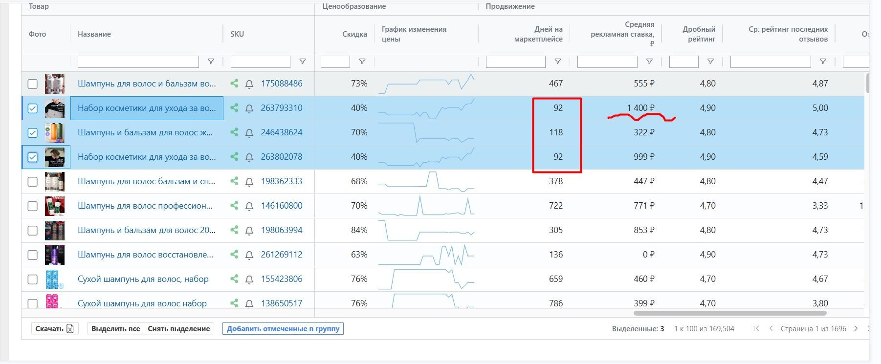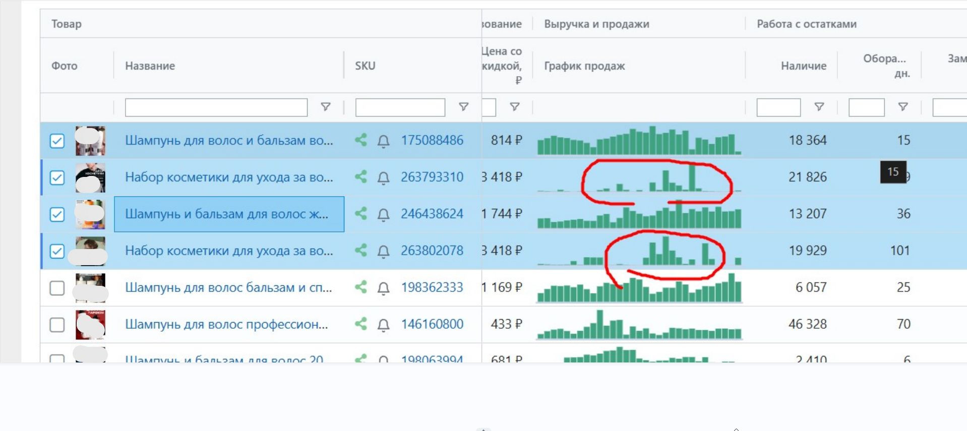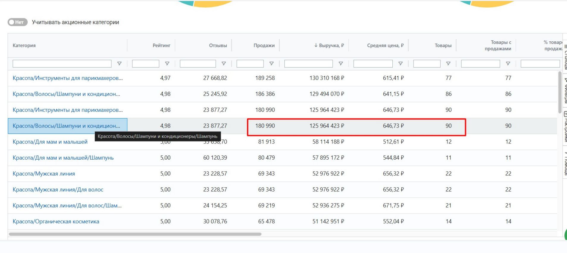 1 и 2 товары набрали схожее количество миллионов рублей, но 1 товар — это шампунь + бальзам за 814 рублей, а второй товар это шампунь+кондиционер+крем+маска за 3418 рублей.