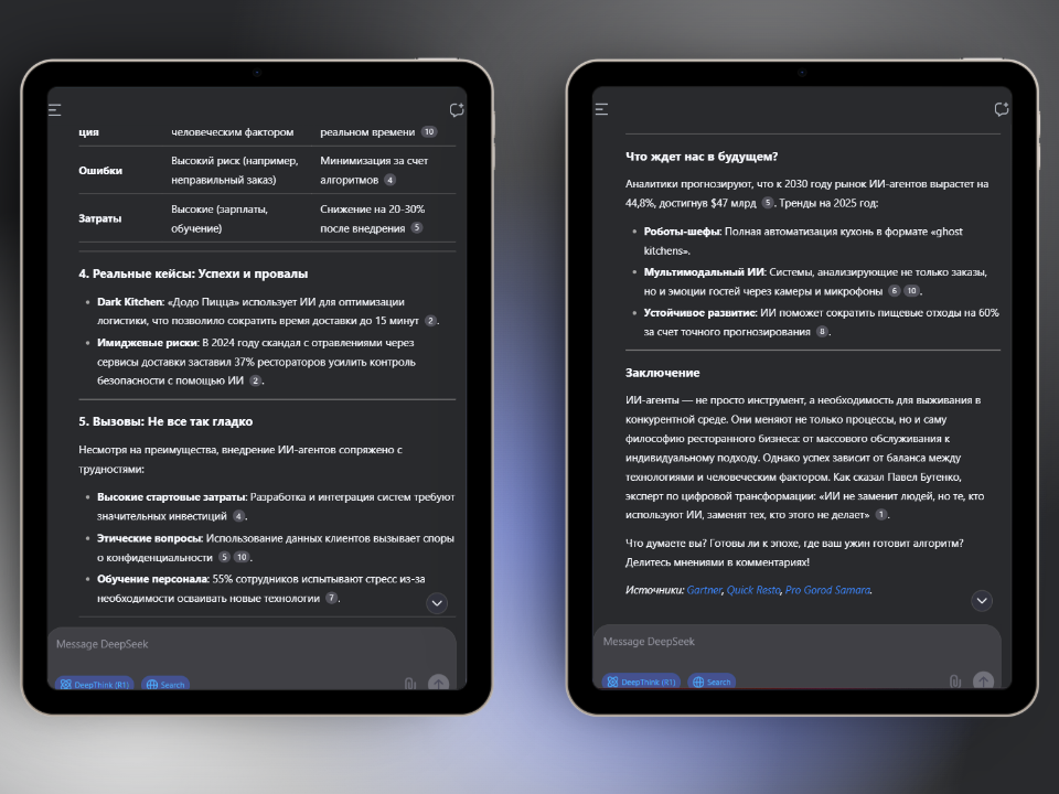- Поиск информации: Встроенный поисковик — не «фильтр-пузырь» как у Perplexity. Когда вы спрашиваете о трендах доставки еды, DeepSeek лезет в отзывы на Tripadvisor, отчеты Delivery Club и даже нишевые блоги. Но есть нюанс: иногда попадаются китайские источники — придётся уточнять «искать в рунете».