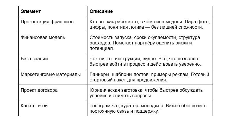 Чтобы запустить франшизу, не обязательно готовить сотни страниц. Достаточно собрать ядро — комплект, с которого партнёр может начать работу и понять вашу модель: