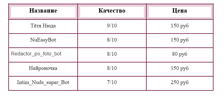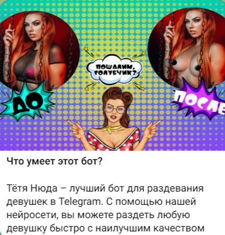 Ссылка — t.me/Snyat_odejdu_super_bot Цена: от 150 рублей за 2 фото Мой вердикт: хорошее приложение с функцией мгновенного раздевания девушек по фото с доступными тарифами. У сервиса помимо бота в Telegram есть свой сайт. Функционал: NuEasy — один из первых русскоязычных ботов, который научился раздевать не только девушек, но и мужчин. Его функционал позволяет за считанные секунды создавать жаркий контент категории 18+. Разработчики сумели объединить в нем сразу несколько продвинутых технологий ИИ и глубокого машинного обучения, что является лучшей гарантией получения гипер реалистичного результата голых девушек. Алгоритм работы с NuEasy включает всего несколько шагов: Способы оплаты: бот доступен пользователям со всех уголков земного шара. Для оплаты обработки можно воспользоваться картами российских, казахских, украинских банков, электронными и криптовалютными кошельками. Ссылка: t.me/tetya_nuda_bot Цена: от 150 рублей за 2 фотографии Мой вердикт: один из лучших ботов, раздевающих по фото в Рунете. Отличное качество результата и высокая скорость обработки. Отсутствие проблем с оплатой доступа. Функционал: Как показывают многочисленные отзывы в сети телеграмм бот с задорным названием Тётя Нюда стабильно удерживает пальму первенства по популярности среди пользователей. В целом, ничего удивительного в этом нет: сервис отличается продуманным функционалом и превосходным качеством раздевания по фото онлайн. Не возникнет проблем и с его использованием: переходите в бот в Телеграмм, жмете на кнопку «Старт», знакомитесь с пользовательским соглашением и на этом, собственно, все — можно приступать к раздеванию девушек. Промежуточный результат придет в размытом виде. Чтобы получить реалистичное изображение высокой четкости необходимости внести чисто символическую оплату в размере 150 рублей за два фото. 6 советов по использованию программы раздеватора: Способы оплаты: оплатить бот для раздевания можно практически любым удобным для вас способом: через электронный кошелек Юмани или Киви, переводом с банковских карт, криптовалютой. Принимаются платежи из Казахстана. Ссылка — t.me/redactor_po_foto_bot Цена: от 80 рублей за фото Мой вердикт: один из самых простых в использовании ботов раздеваторов, рассчитанный на русскоязычную аудиторию. Функционал: Сразу после загрузки бота в Telegram вам предлагают ознакомиться с кучей полезной информацией: примеры обработок, пошаговая инструкция по использованию приложения, реферальная программа. В среднем, чтобы раздеть одну девушку раздеватель тратит от 20 до 40 секунд. Особых требований к исходным фотографиям нет — хорошее качество, адекватный размер, отсутствие в кадре посторонних предметов, закрывающих тело. Оплатить обработку можно пакетом или по факту выполнения поставленной задачи. Но здесь необходимо иметь в виду, что в отличие от той же Тёти Нюды раздеватор размывает снимки весьма старательно и без денег здесь попросту нечего ловить. Способы приобретения: Купить можно от 1 до 200 фото по цене от 80 до 6000 рублей. Оплатить подписку можно переводом с банковской карты или электронного кошелька Юмани или Киви. По согласованию с администратором возможно использование и других способов оплаты. Ссылка — t.me/NuRoom Цена: 150 рублей за два фото Мой вердикт: шустрый телеграмм бот с высоким качеством генерации фото категории 18+. Нейросеть постоянн