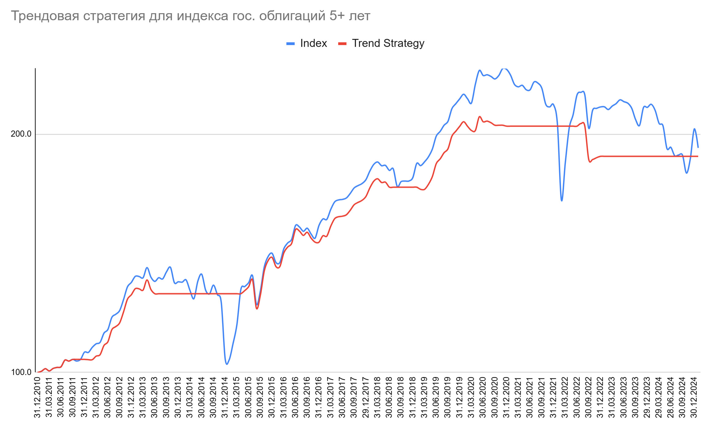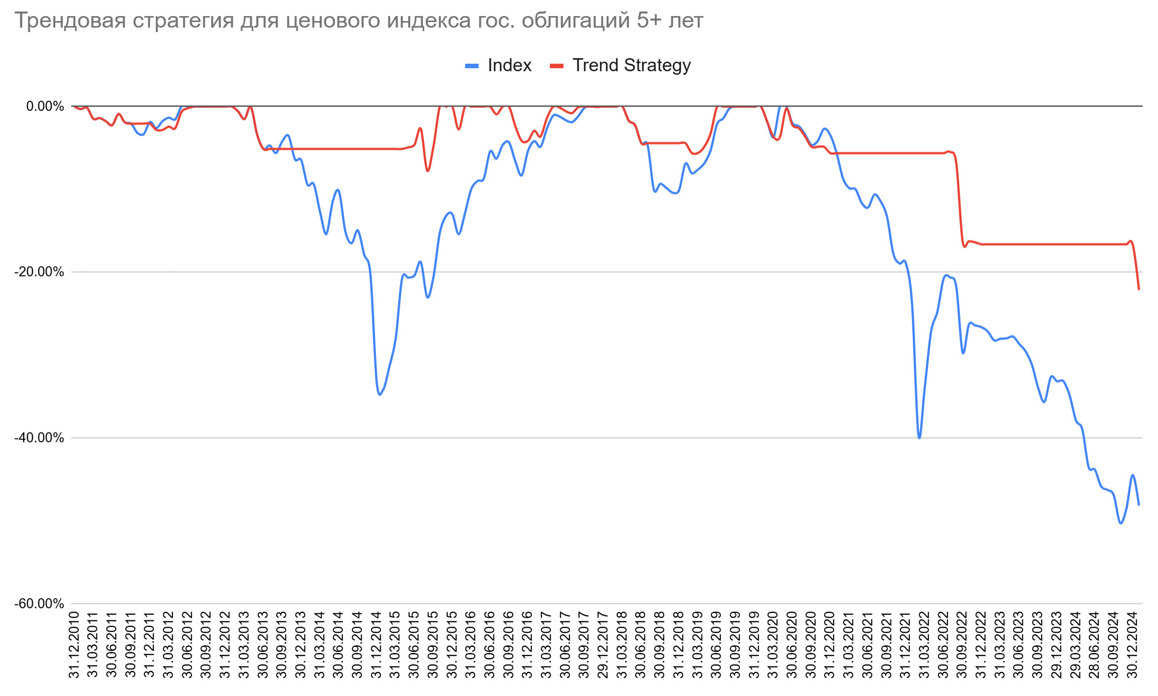 Не хуже трендовая стратегия подходит и для волатильных долгосрочных ОФЗ. Вместо того, чтобы пытаться поймать дно и потом терпеть убытки, можно применить трендовый подход. Вот какую доходность мы получаем в сравнении с индексом долгосрочных ОФЗ: Здесь доходность оказалась немного меньше, что нормально для трендовой стратегии, но посмотрите, насколько ниже просадки: Дополнительно отмечу, что это лишь самые простые примеры без дополнительной оптимизации, которая позволяет повысить доходность стратегии. Мой проект ГлавИнвест — это разбор стратегий и инструментов пассивного инвестирования на биржах России, Казахстана, ОАЭ и США. На этой неделе разбираемся с применением трендовых стратегий в России. Приглашаю в Телеграм-канал
