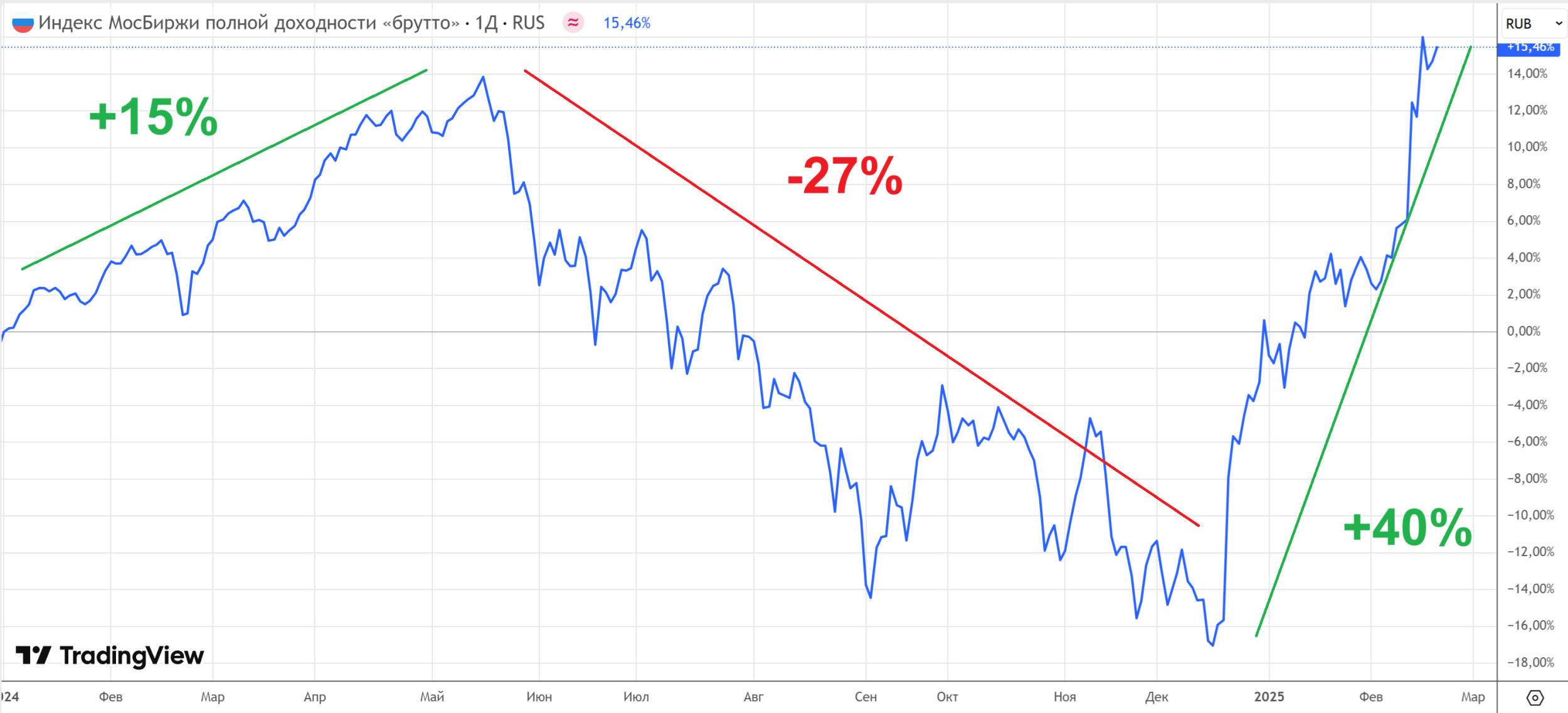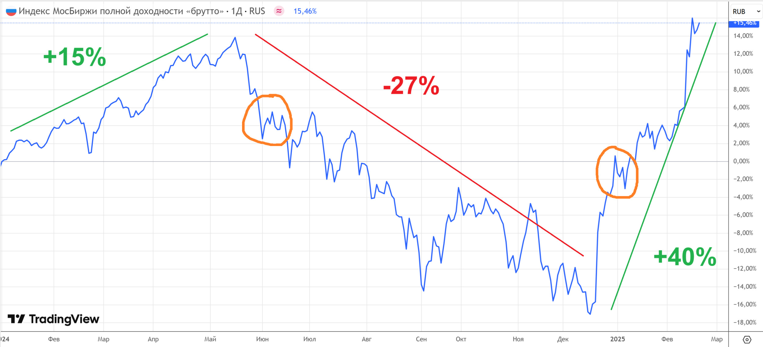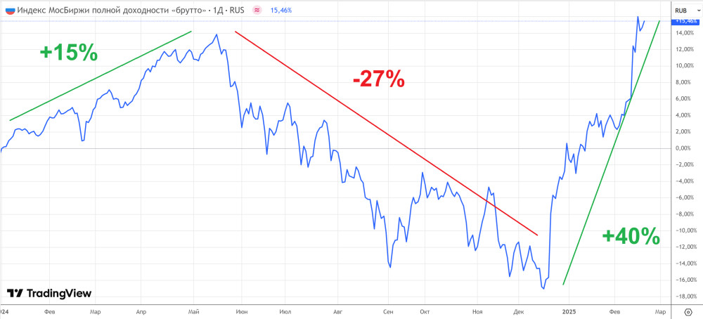 Сначала был неплохой рост, который сменился долгим глубоким падением. Рынок падал с мая по середину декабря. Многие аналитики и Телеграм каналы были полны пессимизма. И как всегда внезапно произошел разворот. В феврале мы преодолели максимум 2024 года.