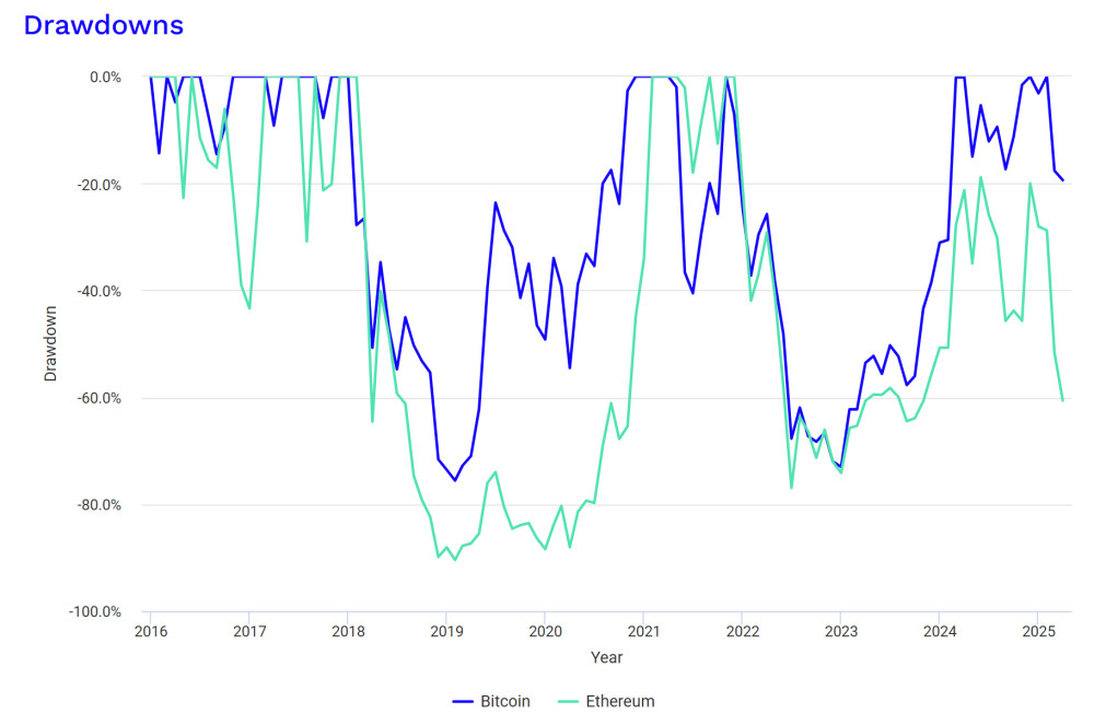 Если смотреть исторический график просадок, то можно увидеть, что ранее просадки Биткоина (синий) доходили до 70-75%. Однако в 2025 году его падение составляет около 20%, что для него совсем немного.