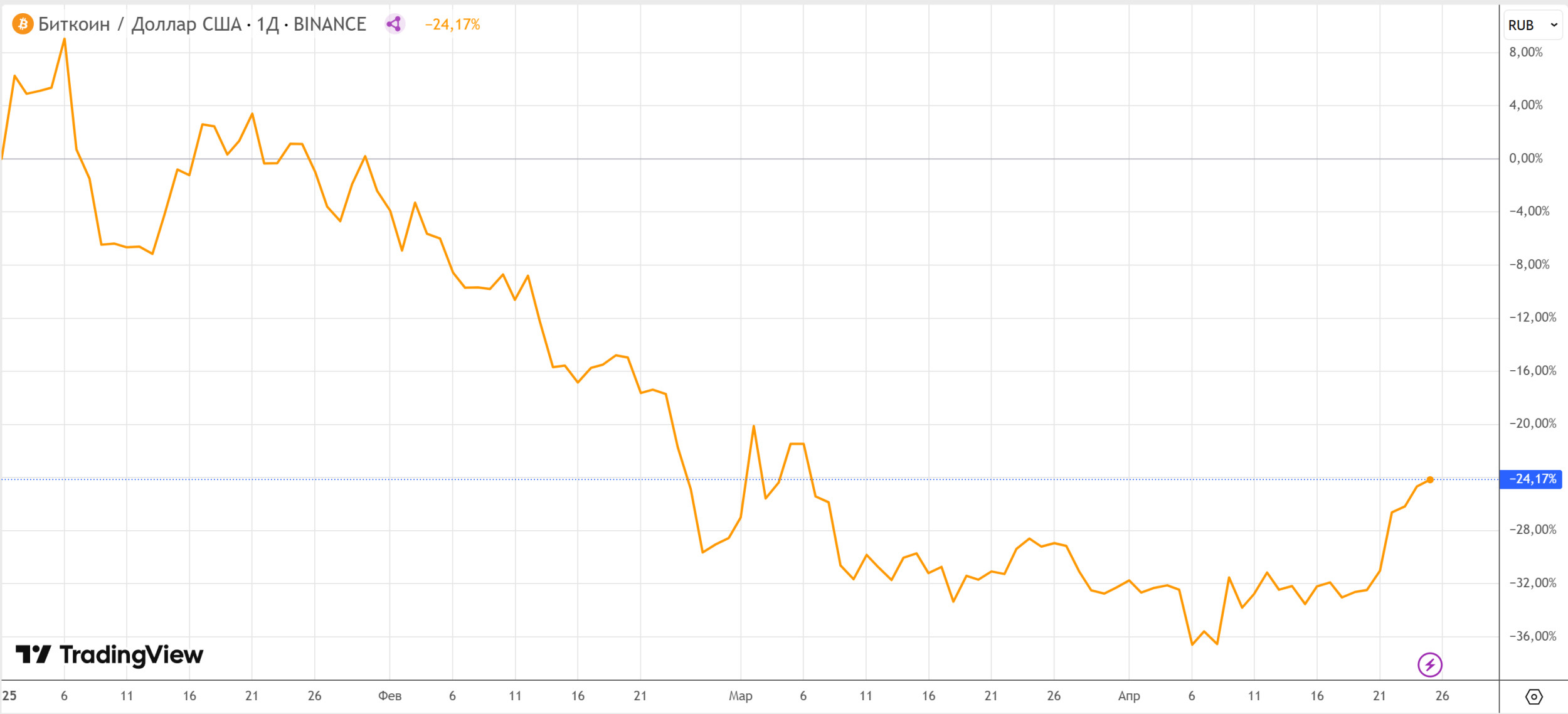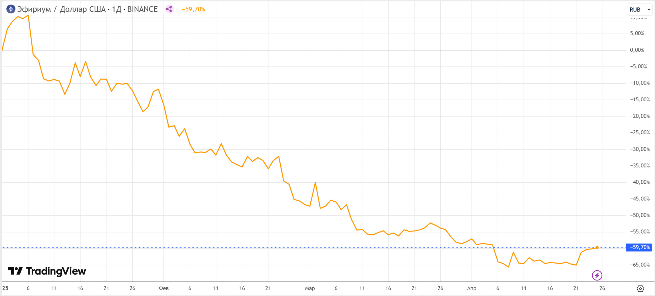 Вот график Биткоина с начала 2025 года. Как видите, он уже отыграл часть падения и с начала года показывает нулевой результат: Картина сильно меняется, если мы построим график не в долларах, а в рублях. И это актуальнее, если вы получаете и инвестируете рубли. Вот как выглядит график в этом случае: Просадка с начала года до сих пор остается на уровне 25%, а с пика — более 30%, то есть покупать весьма выгодно. Еще интереснее выглядит цена Эфира в рублях: С начала 2025 он потерял около 60% — ничего такая просадка. Конечно, мы не знаем, куда цены пойдут дальше, и они всегда могут еще упасть, но статистически сейчас достаточно выгодный момент для покупки криптовалют, особенно в рублях. Какие лучше покупать, и какими долями добавлять в портфели, разберем сегодня вечером на вебинаре «Криптовалюта в пассивном портфеле». За подробностями приглашаю в Телеграм-канал