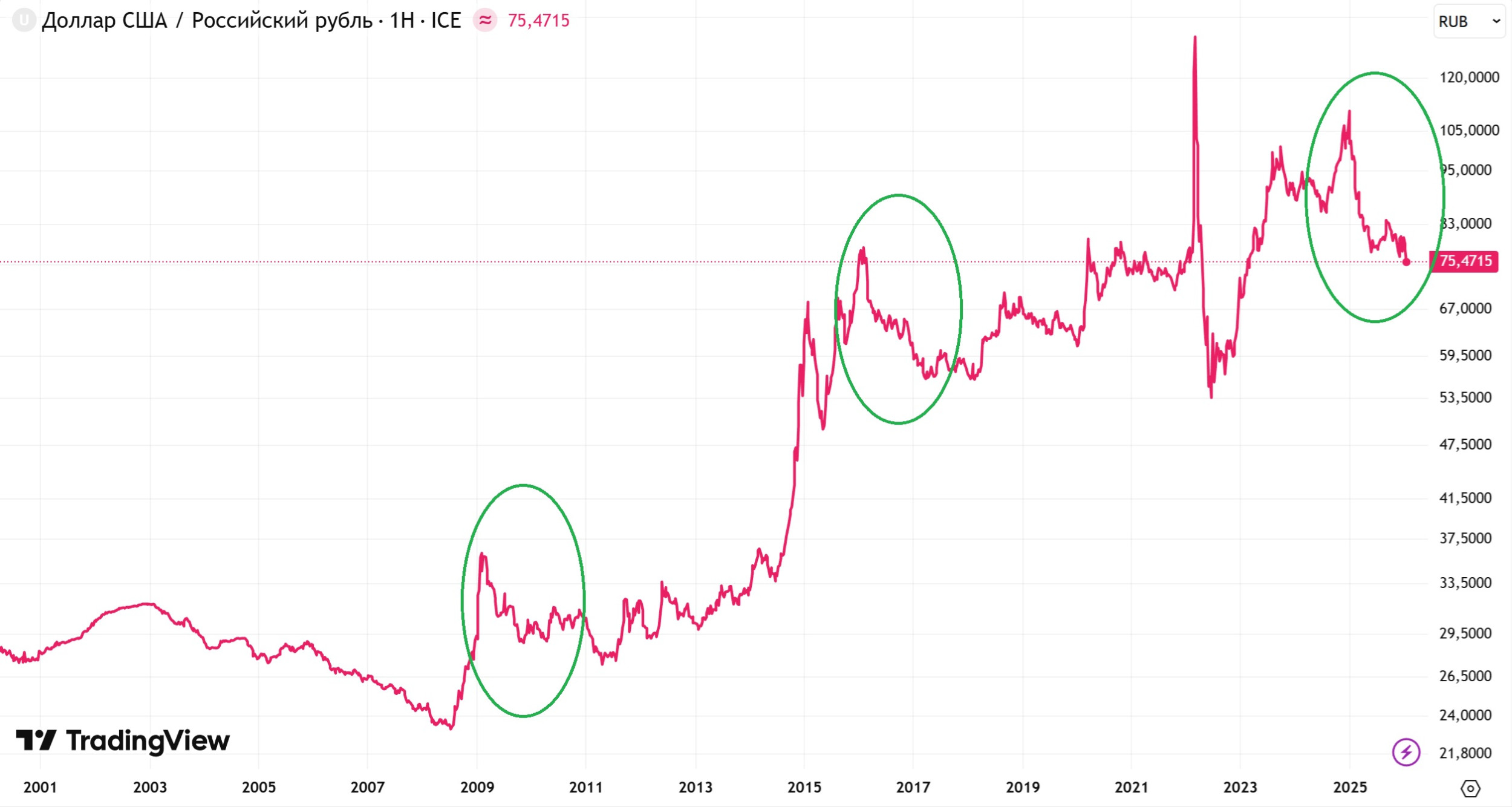 Можно заметить, что несколько раз похожая картина уже наблюдалась. (Я отметил зеленым текущую ситуацию и максимально похожие. Резкие колебания 2022-2023 даже выделять не стал). Во всех случаях после этого начинался продолжительный рост на несколько лет. В 2018-2020 гг рост составил 40%. Конечно, это не значит, что нужно всё бросать и бежать скупать валюту, но проверить и обдумать валютную часть своего портфеля точно не будет лишним. Какие валютные инструменты без санкционного риска можно для этого использовать, разбираем на этой неделе в Телеграм канале https://t.me/glavinvest