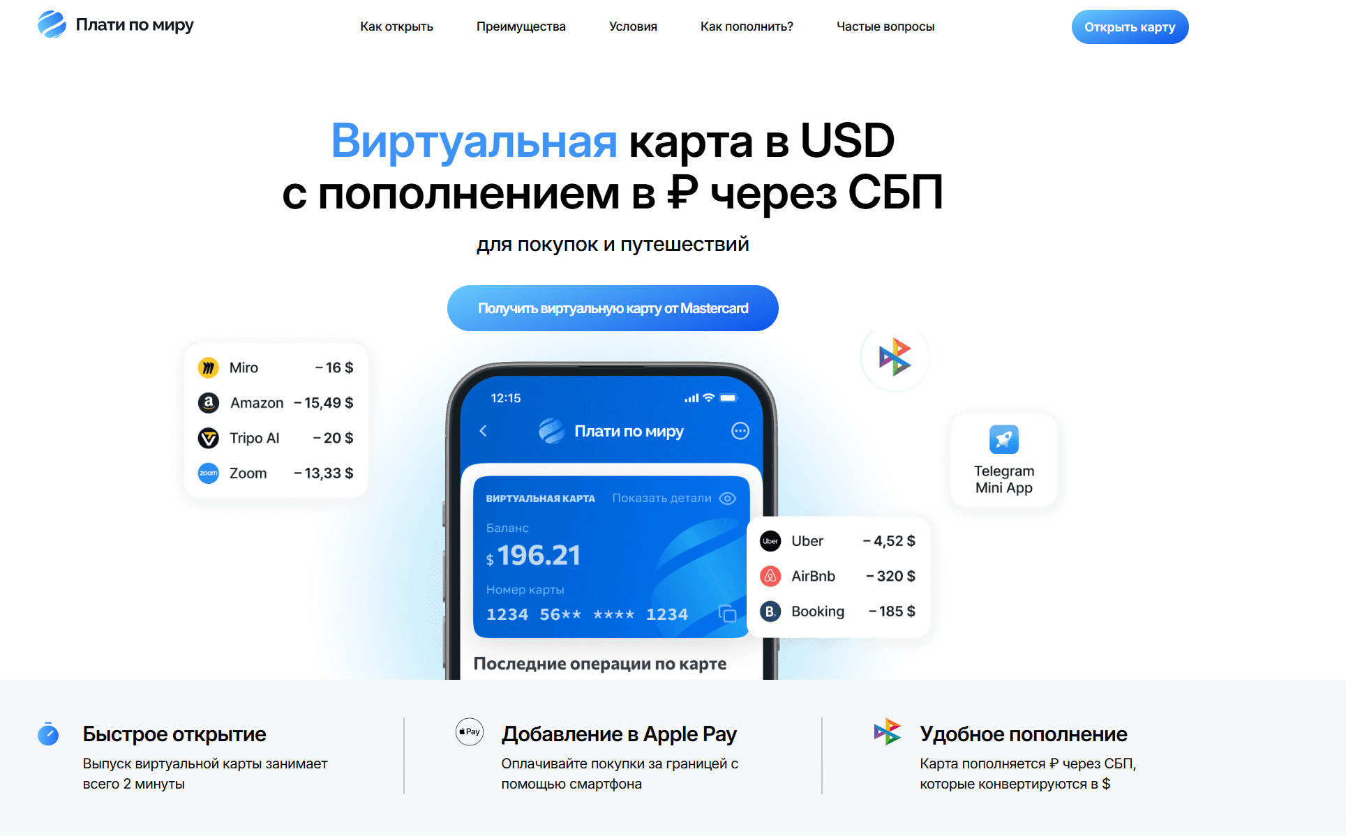 Лучше всего подходят карты, которые можно пополнять из России. Пополнение через СБП или криптовалюту делает путешествие намного комфортнее — баланс всегда под контролем, и не нужно искать обходные пути. Среди таких решений особенно выделяются виртуальная карта «Плати по миру» с моментальной активацией и удобным приложением.