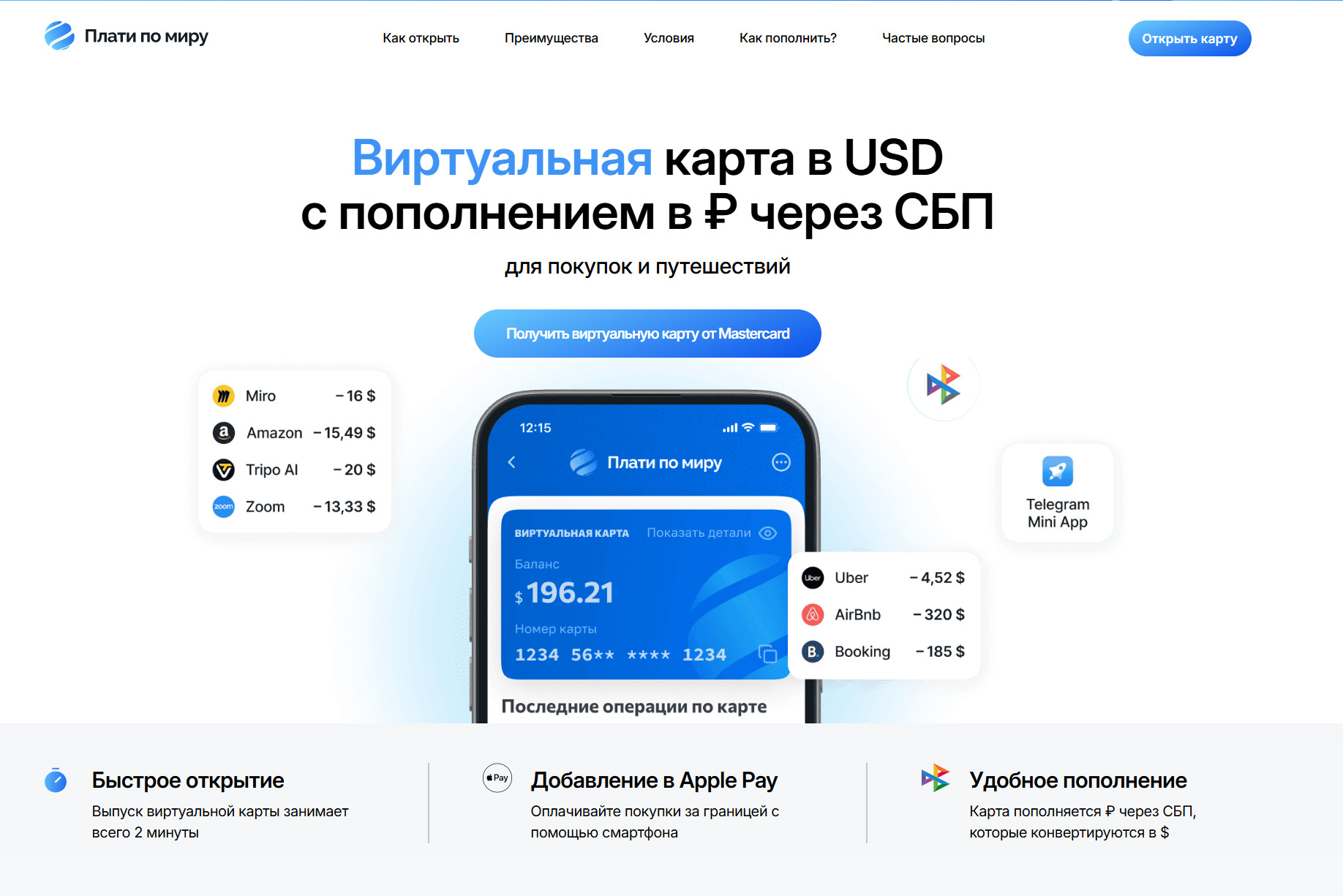 - Виртуальная карта «Плати по миру» — удобный инструмент, который можно пополнять через СБП и использовать для онлайн-покупок и платежей за рубежом.