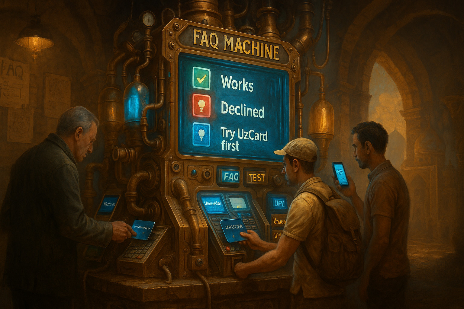 UnionPay — альтернатива, которую всё чаще выбирают путешественники. Она принимается в банкоматах и торговых сетях и подходит тем, кто планирует поездки по Азии. Однако в регионах Узбекистана её поддержка ограничена, а комиссии иногда выше, чем у местных карт.