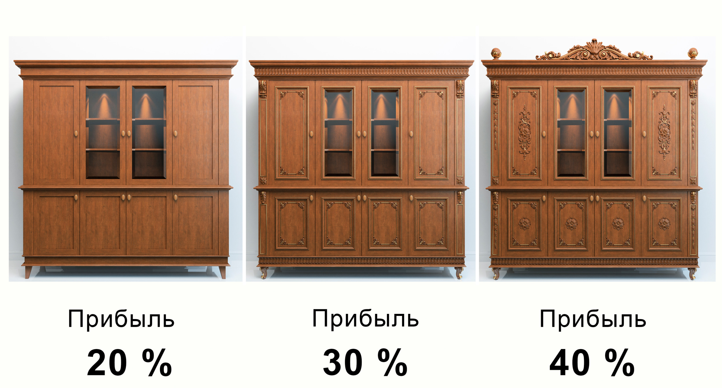 Добавим к этому еще и конкурентное однообразие. На большинстве производственных рынков преобладает однотипная продукция. Например, на мебельном рынке — одинаковые шкафы, стандартные двери, похожие кухни. Клиент не готов платить много денег за привычное, ведь дизайн и внешний вид тот же самый. За что платить больше?