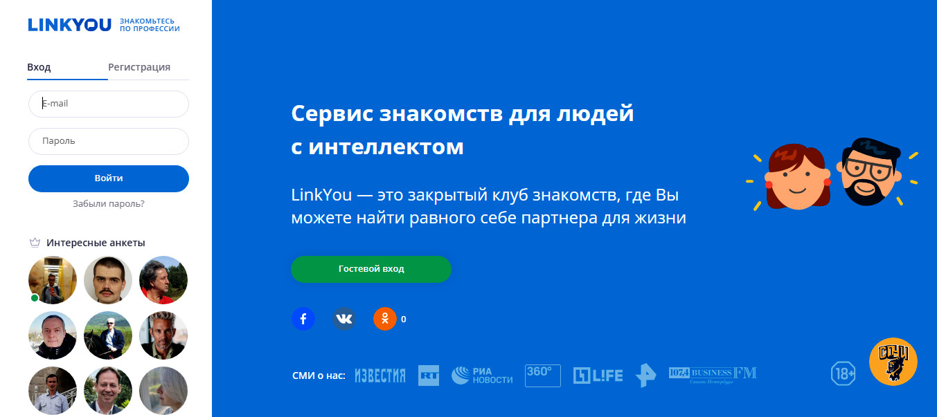 - Linkyou — моментальная регистрация, вход через соцсети, быстрый поиск.
