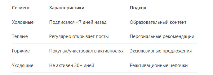 Важно: Начинайте с простых сценариев (например, разделение на новичков и постоянных подписчиков), затем усложняйте систему.
