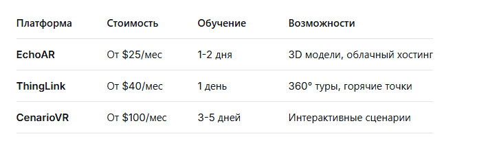 python# Оценка возможностей для разных тематик ar_vr_strategy = { 'ecommerce': ['AR-примерочная', '3D-просмотр товаров'], 'education': ['VR-лаборатории', 'Интерактивные симуляции'], 'entertainment': ['AR-игры', 'Виртуальные мероприятия'], 'real_estate': ['3D-туры', 'AR-визуализация мебели'] }