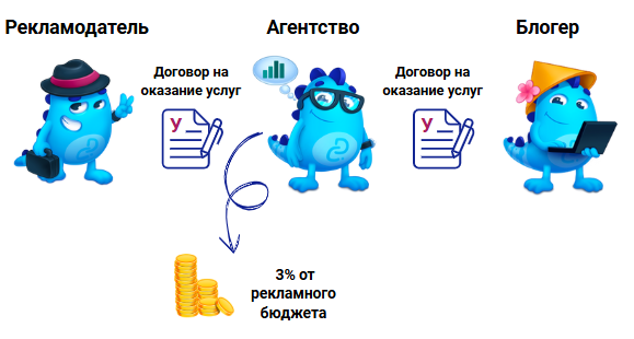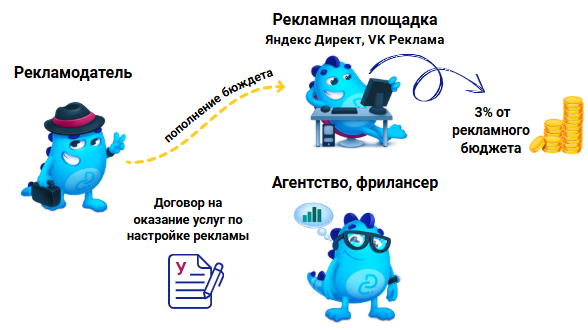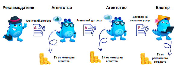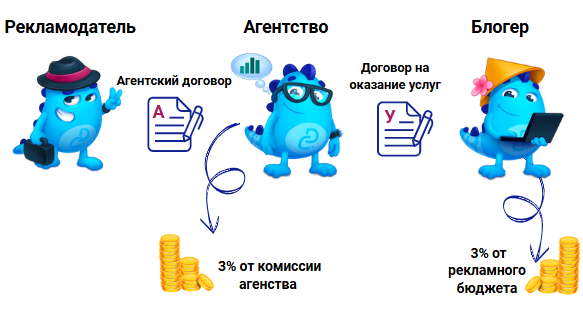 Пример № 1. Самый простой вариант — в цепочке участвуют два звена: рекламодатель и рекламораспространитель (например, размещающие рекламу блогер или сайт). Между ними заключен ДОУ. В этом случае рекламораспространитель получает от рекламодателя как деньги на рекламный бюджет, так оплату за свои услуги.