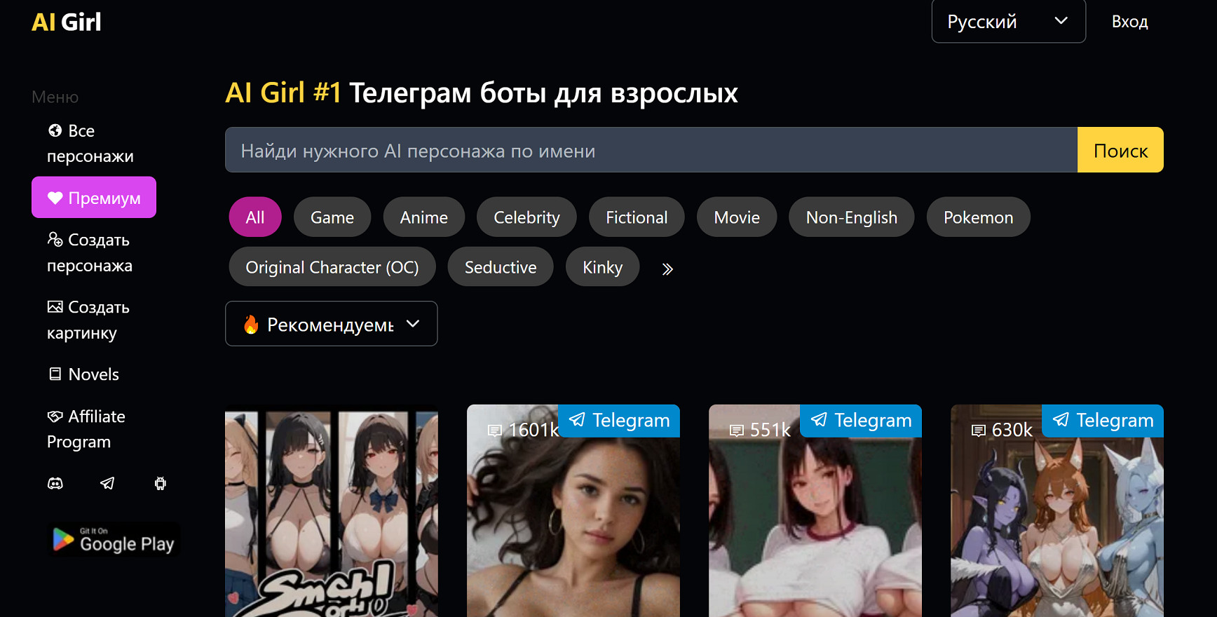 AI Girlfriends (18+). Коллекция разных виртуальных подруг под любое настроение — от романтичного общения до смелых ролевых сцен.