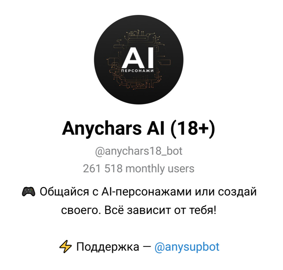 Anychars AI (18+). Интимные доверительные переписки вокруг личных фантазий с гибкой настройкой откровенности.