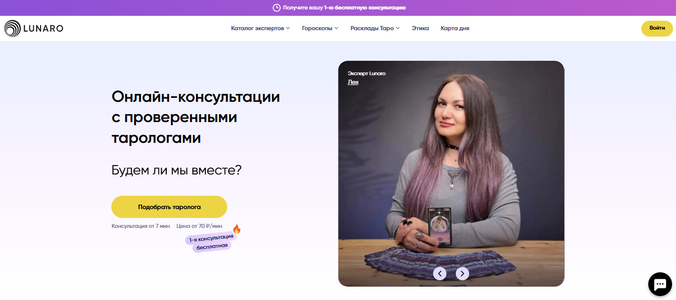 - Нужна личная беседа и фото карт? Идите на Lunaro — семь бесплатных минут, строгий отбор экспертов.